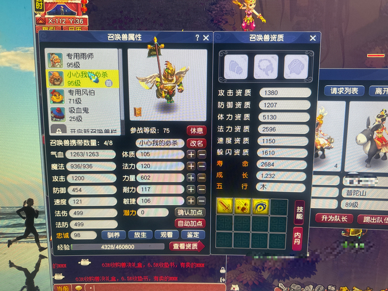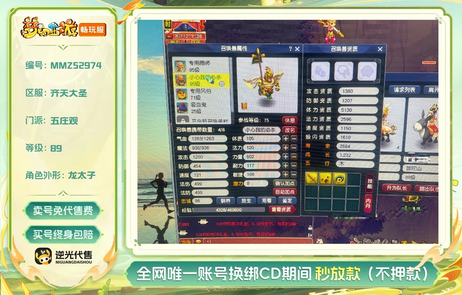 4pt一武装,装备都有,副本基本通刷,武装攻击修炼10 防御5 普陀法修3个8一个9 防御都是5点, 烹饪技能4个号89,练药一个号85,两套房子紫气豪宅,可以平常卖烹饪和三药。宝宝的话 高比夜战95级左右,还有血敏雨师。仓库未清理,懒得清理,副本基本也不少。着急出,绿通还有2天,价格可以谈。
