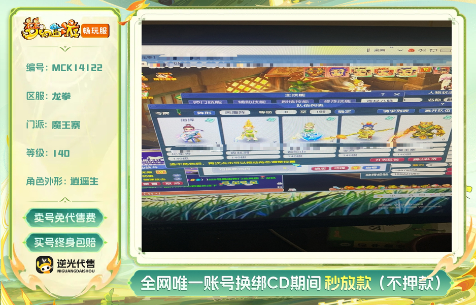 总经验:10000万 | 等级:140 | 龙宫,盘丝洞,魔王寨,化生寺,普陀山 | 无换绑CD | 180天尊享特权 | 男 | 【逆光代售卖号0手续费】【买号找回永久包赔】