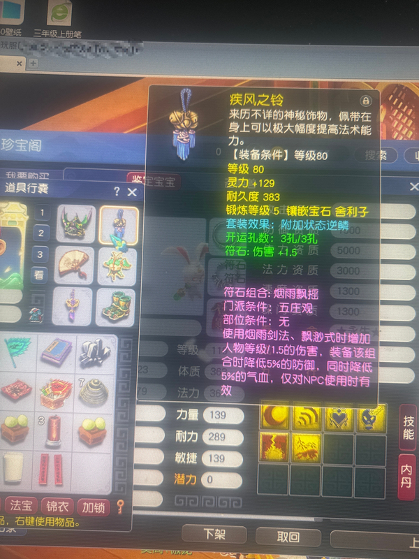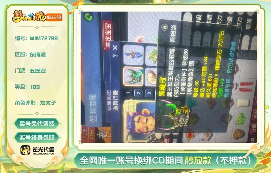 价格带2转玉兔满内丹和全红龙,120块家具的紫气豪宅,520初伤100武器和成品衣服,2件80逆鳞1件70逆鳞,通刷一切,两套属性,体耐和全力,4修全满可封可打,存4亿左右经验,仓库一堆东西未动