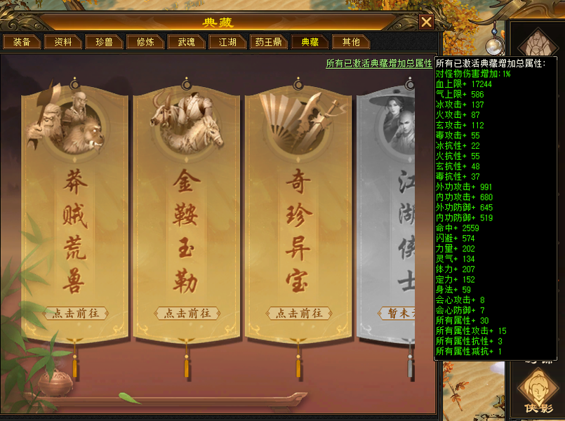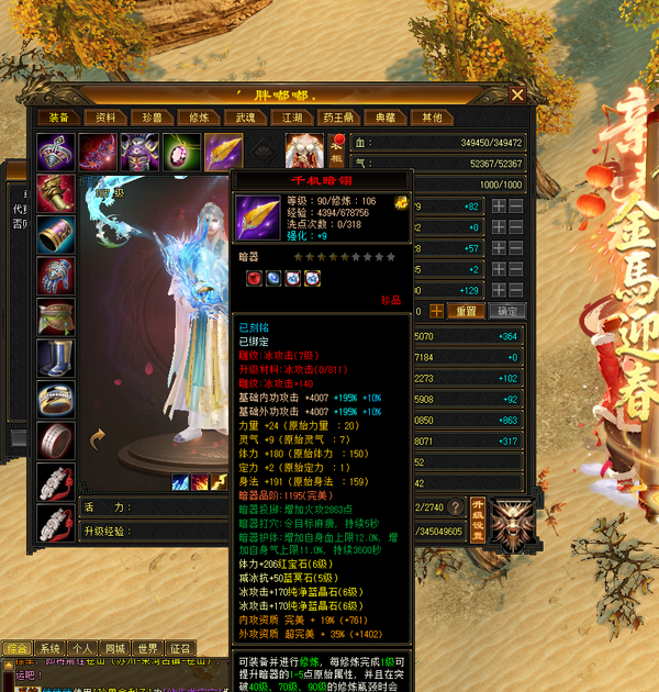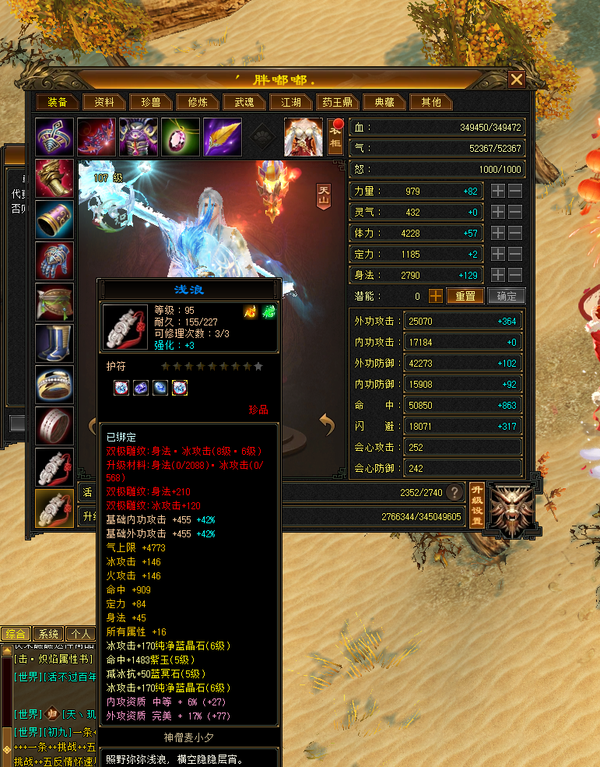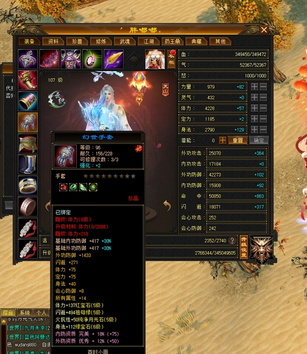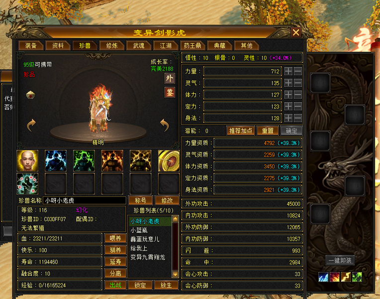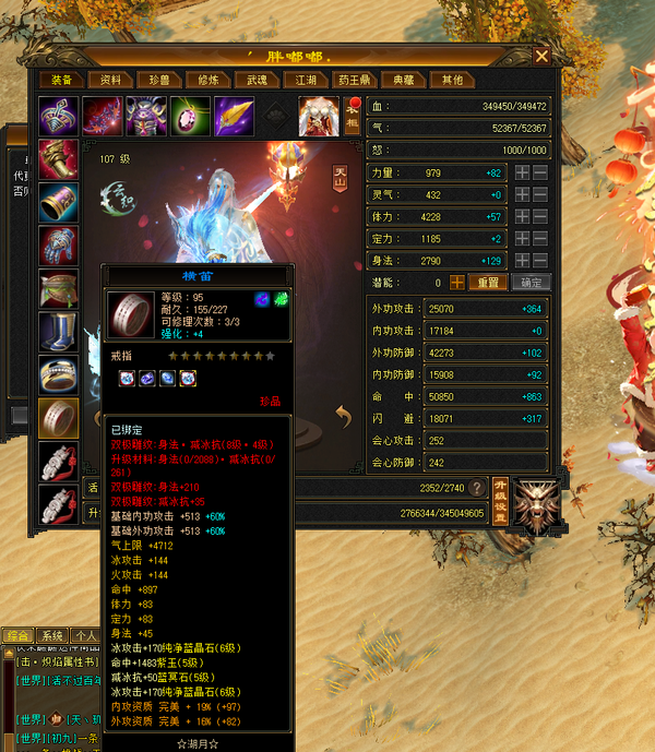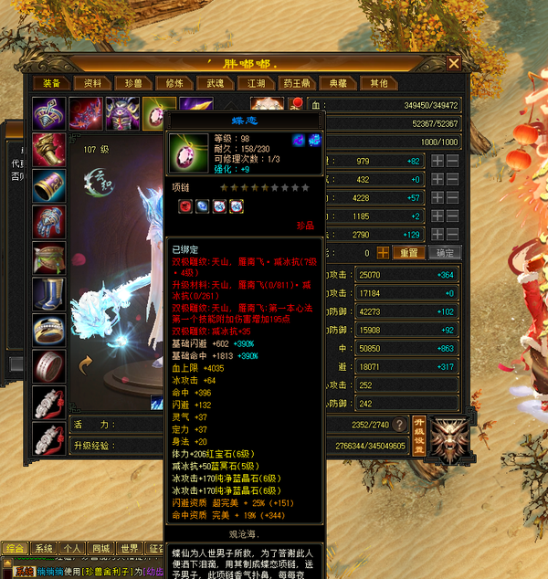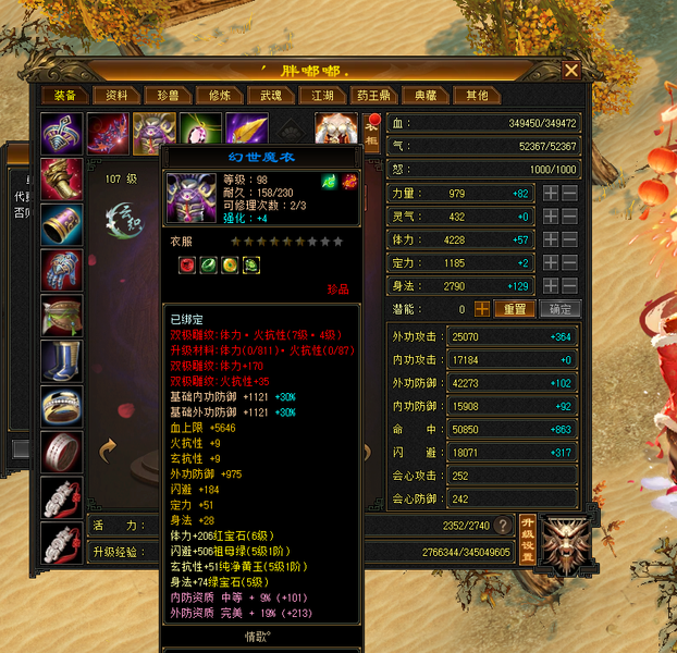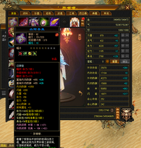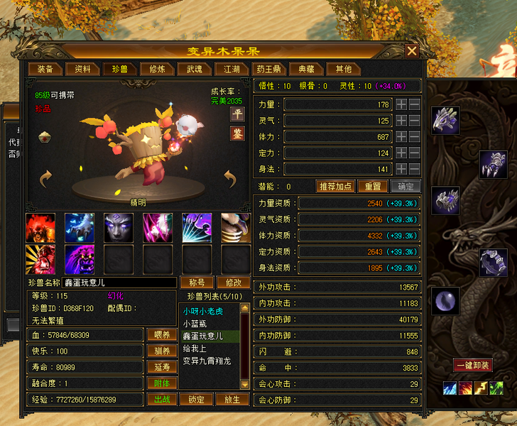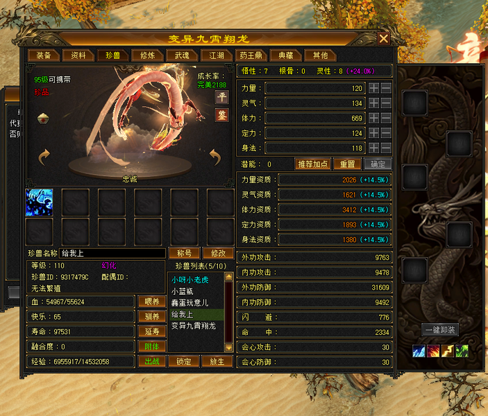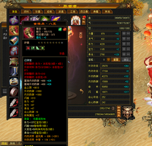 装备收齐 纯正成品号 地雕身法8雕 体力两个8雕 其他地雕为7雕 天雕 减抗属性 抗性收齐。 重楼肩 30个8级,时间到了就能合成。大完美武魂 神器7星已经洗好词条,附体pk宝宝已全。
