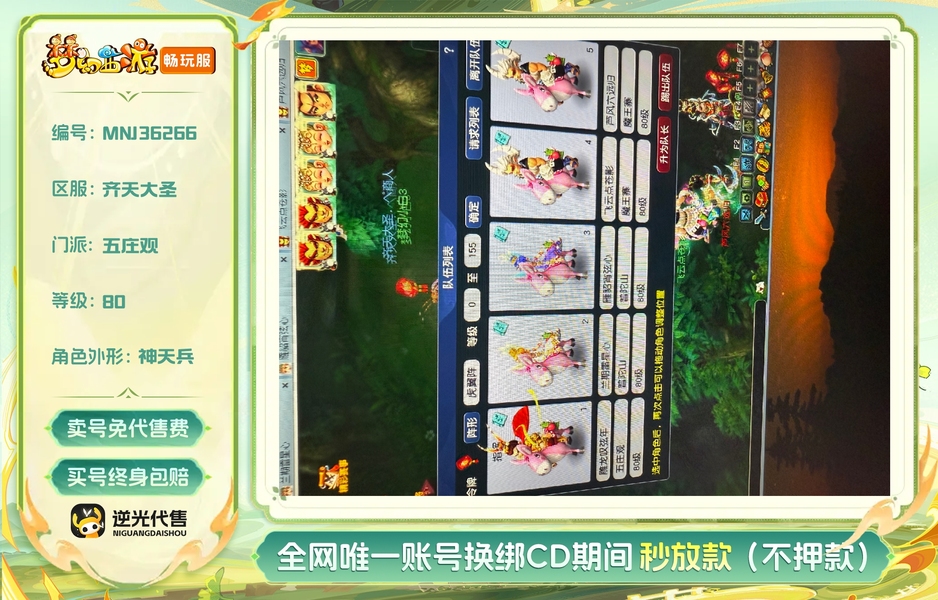 80级一组1五庄2普坨2魔王,带粉驴装备都是没打宝石,绿通98天,买回来不会玩,没cd可以叫号主人脸换绑,带垃圾宝宝