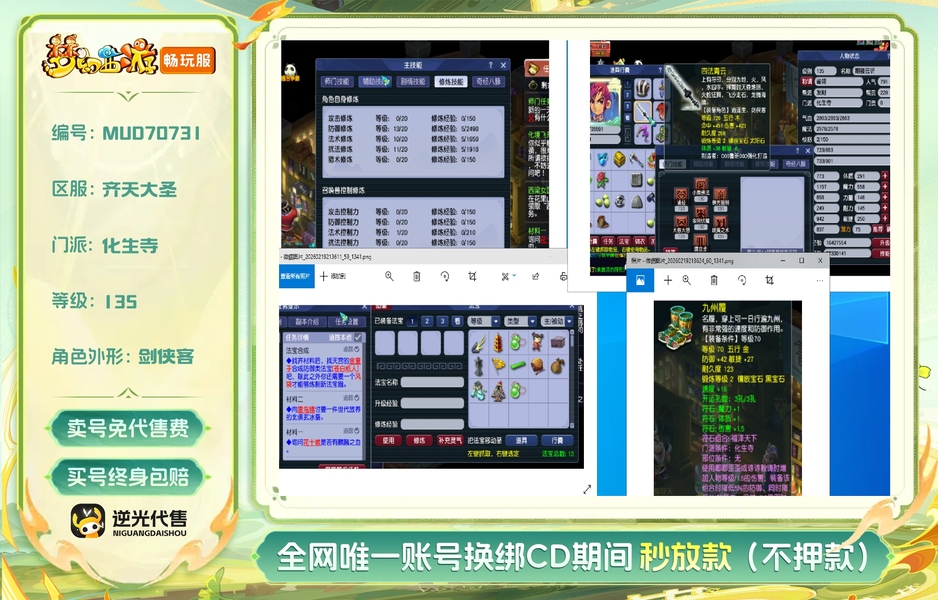 没时间玩了,马上开班了,5个号135级,120大光+双三孔,高资质芙蓉,元宵节活动结束随时飞升,两个号有家具包,一个豪宅,仓库没清理,接近7W副本积分,法宝都齐全,诚心出,通刷一切