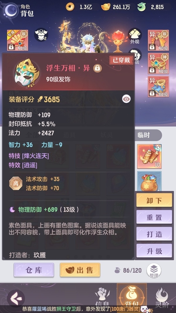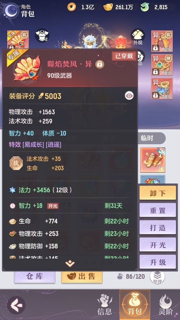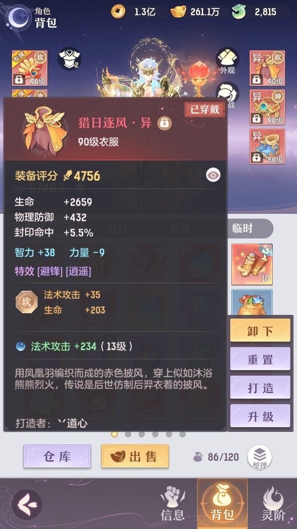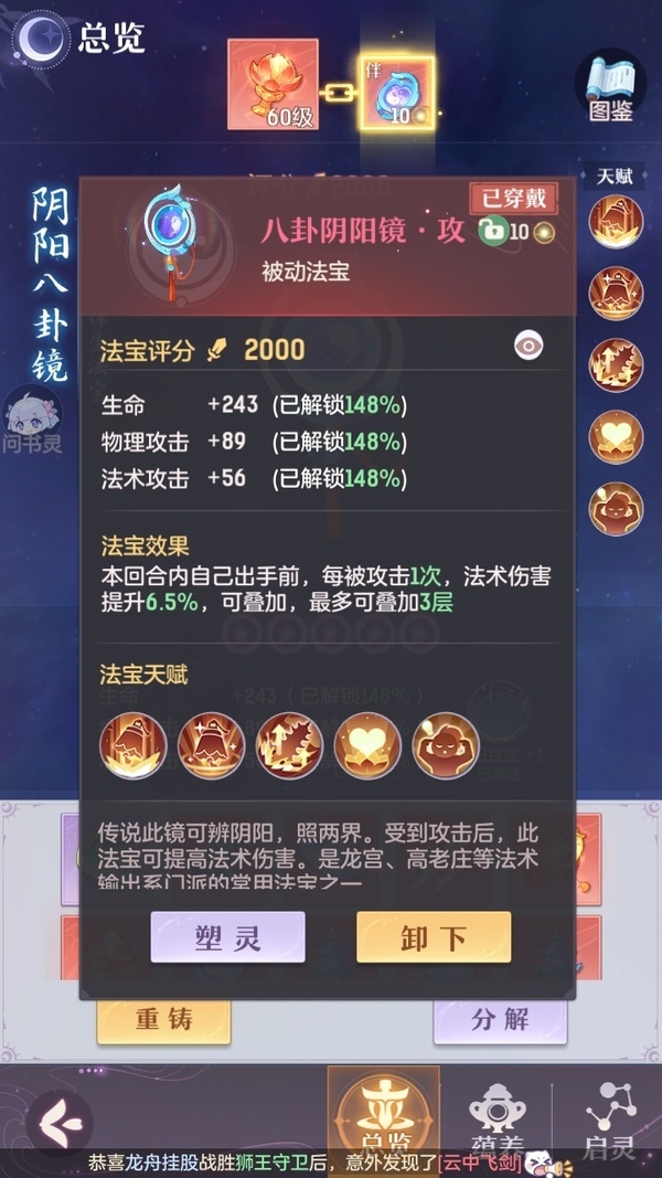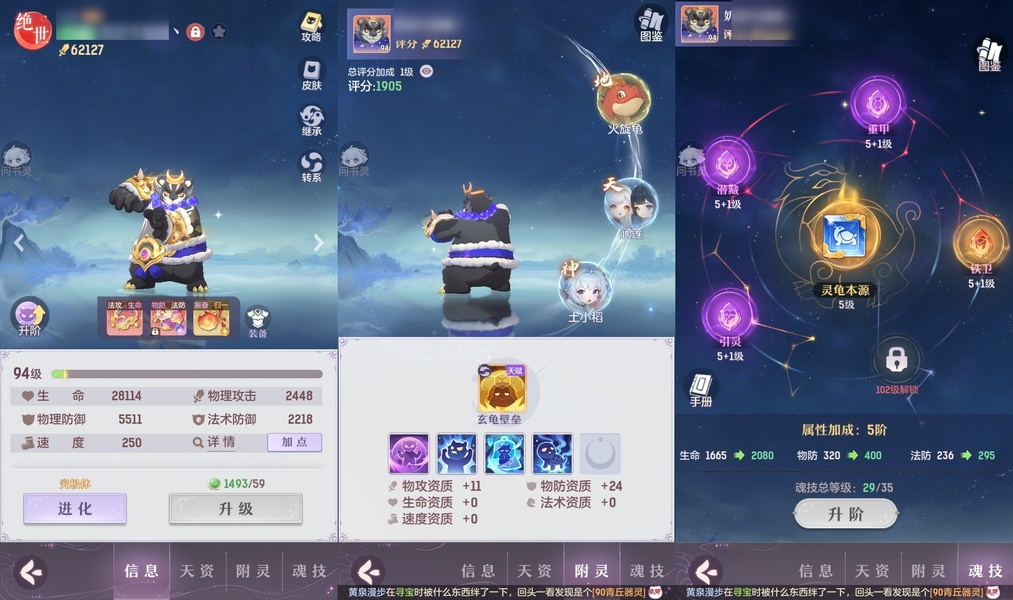 颜值:19260 | 等级:89 | 龙宫 | 神兽数:5 | 法宝颜色统计:10红0蓝 | 总评分:393982 | 角色评分:87483 | 妖灵评分:206189 | 灵师评分:100310 | 倾天三 | 淬金曜蚀,织梦星海,乘波踏浪,山君现,清寒羽冽,灵鸢一梦,墨染尘烟,星河揽月,离火苍龙,九春韶华,火树银花,哈?我当武器?,碎梦语情,炙烤大串,一刹雷鸣 | 蝶恋芳菲,火神·赤曦 | 祥云,蟹有钳,钱多多,灵华引,星昀渡,比翼同舆,万海真君,罗帷七香车,飞起来·壹号,负山海,跃龙门,鸭与云游,喵小萌,飞天笔,飞龙在天,红莲·出尘,兔球,风火乾坤,大荒之主,海月璃梦,贯日神君,焚天火凤,花将军,招财进喵,初弦瑶桂,乘风入梦,狐心入梦,风驰电掣,踏火焚夜,凤蝶·梦浮生 | 【买号找回永久包赔】