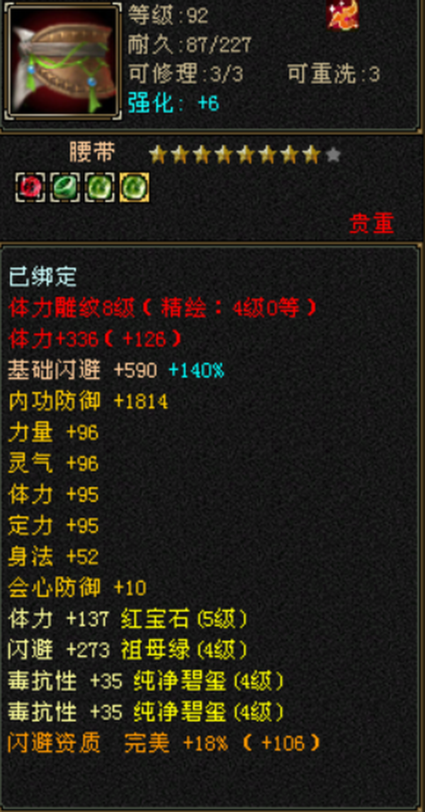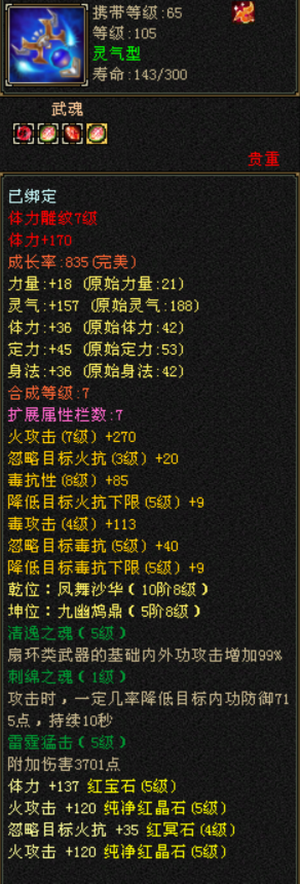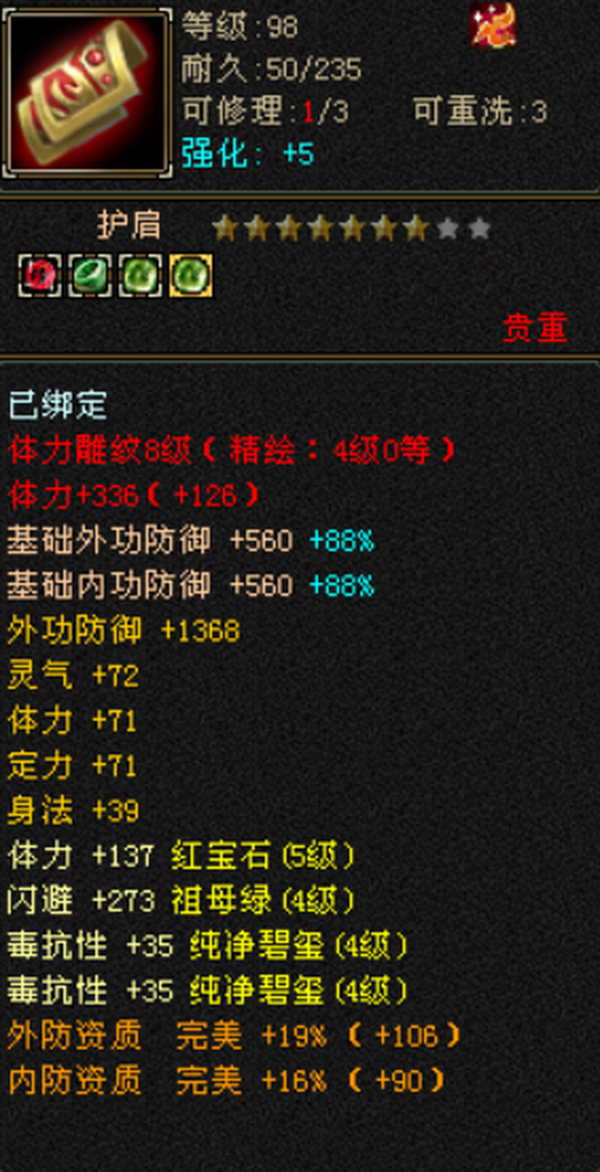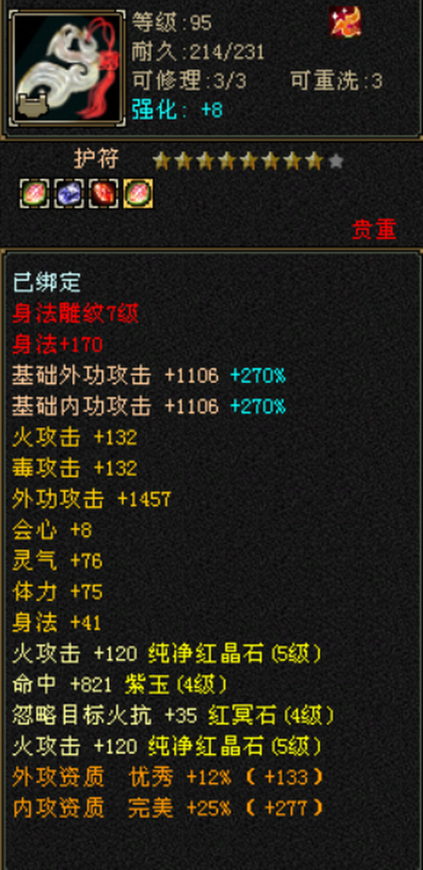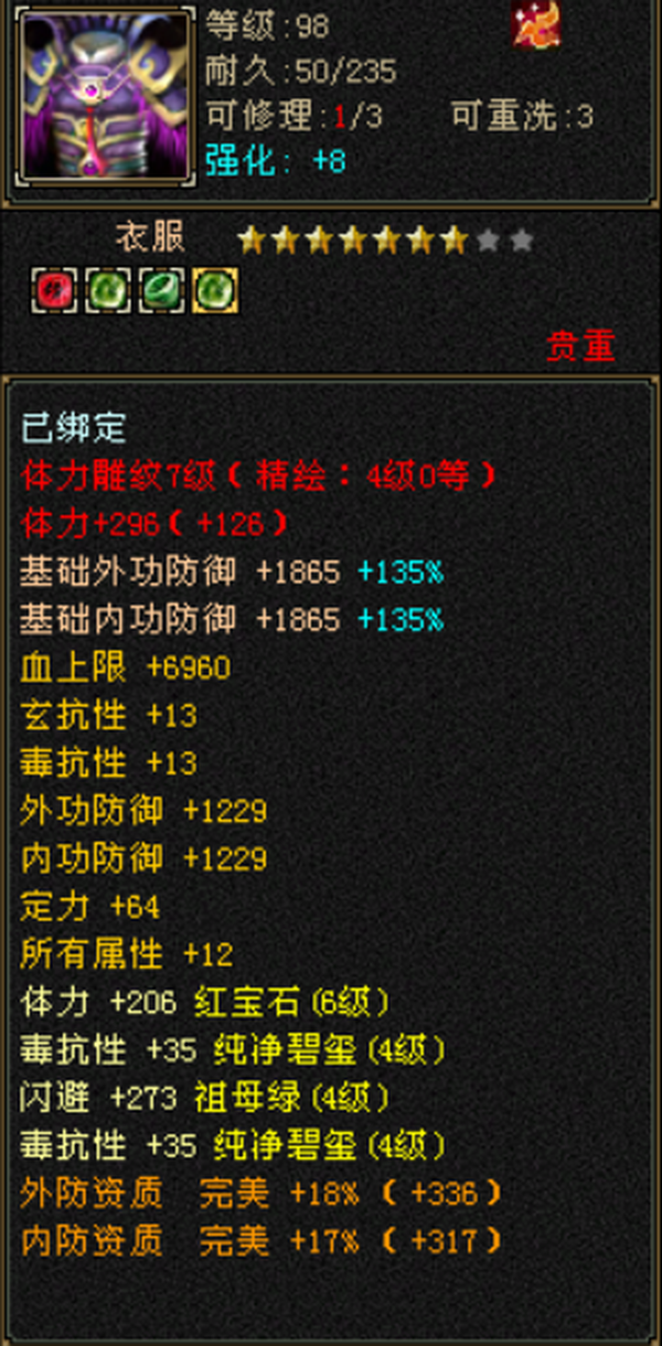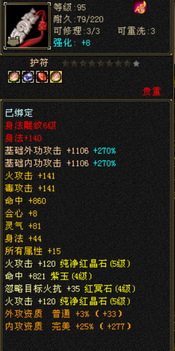 逍遥极品大8星项链,一掷千金消费了将近130万元宝,5326火属性,500多毒抗,昆吾声望满级9级,10矿9药,5荒兽全紫属性条,4个8级体力雕文,其他全7属性雕文,新雕文基本全4级,退游出,请善待!
