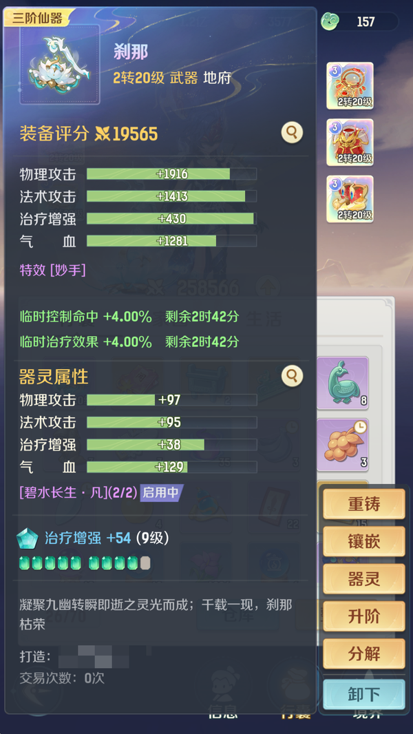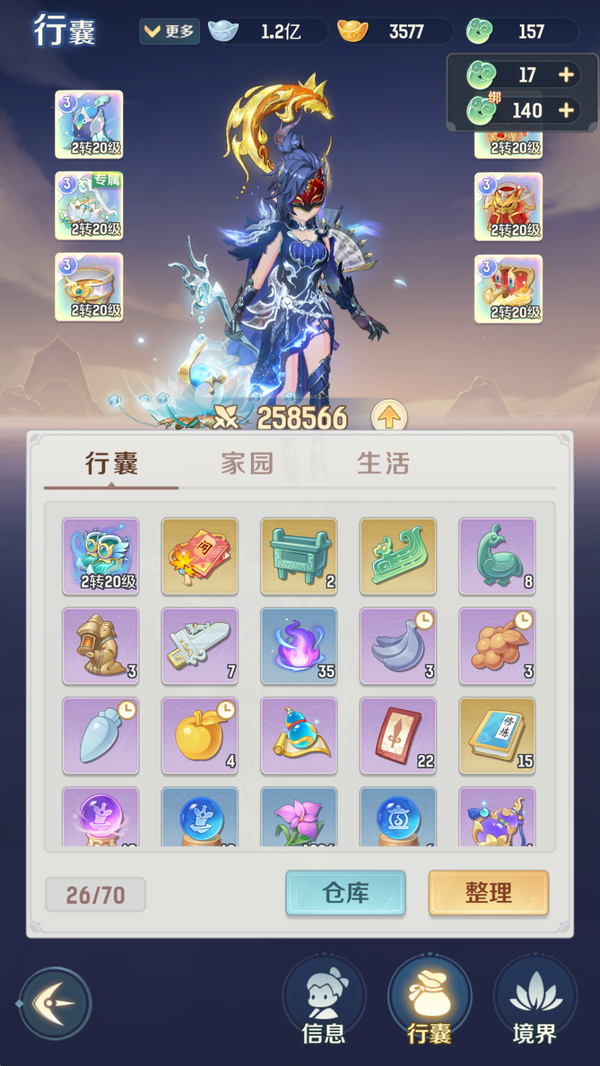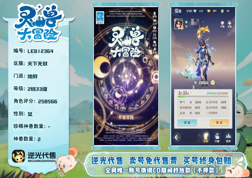 【LEB12364】 | 仙器:6 | 神兽数量:2 | 角色评分:258566 | 珍兽数量:2 | 等级:2转33级 | 地府 | 女 | 画中仙,孙悟空 | 貔貅,龙马