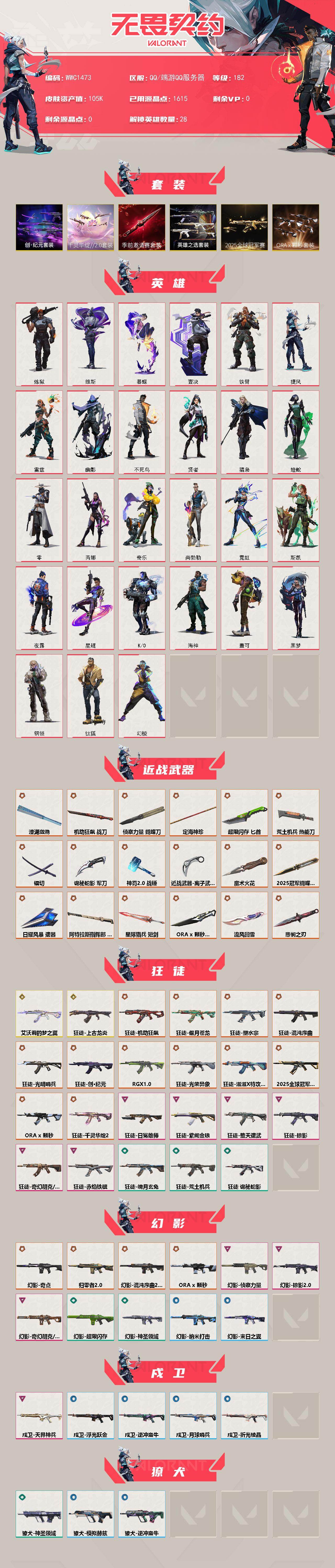 【WXL92129】 | 皮肤资产价值:105300 | 定海神珍,超限闪存匕首,诡秘蛇影军刀,镭切,魔术火花,侦察力量蝴蝶刀,机动狂飙战刀,2025全球冠军赛蝴蝶刀,荒土机兵热能刀,日耀风暴遗器,离子武器2.0爪刀,无畏契约季前邀请赛悲悯之刃,澄湖潋滟,神罚2.0战锤 | 奇点幻影,混沌序曲2.0幻影,纳米打击幻影,超限闪存幻影,侦察力量幻影,奇幻朋克3.0幻影,神圣领域幻影,归零者2.0幻影,末日之翼幻影,掠影2.0幻影 | 奇幻朋克3.0狂徒,上古龙炎狂徒,紫阙金琅狂徒,2025全球冠军赛狂徒,偃月苍龙狂徒,光荣异象狂徒,堕天遗武狂徒,机动狂飙狂徒,混沌序曲狂徒,艾沃莉的梦之翼狂徒,RGX11zPro狂徒,光明哨兵狂徒,诡秘蛇影狂徒,滋滋X特攻队狂徒,塑水宗狂徒,日冕雄师狂徒,魄月玄兔狂徒,荒土机兵狂徒,创·纪元狂徒,掠影狂徒 | 奇点正义,创·纪元正义,纳米打击正义,超限闪存正义,月球哨兵正义,离子武器正义 | 神罚标配,浮光跃金标配,荒土机兵标配,紫阙金琅标配,折光棱晶标配 | 模拟赫兹鬼魅,天界神兵鬼魅,诡秘蛇影鬼魅 | 堕天遗武冥驹,千灵华绽冥驹,模拟赫兹冥驹 | 末日之翼奥丁,纳米打击奥丁 | 月球哨兵戍卫,浮光跃金戍卫,天界神兵戍卫,逆冲蛮牛戍卫,折光棱晶戍卫 | 模拟赫兹獠犬,神圣领域獠犬 | 月球哨兵莽侠,超限闪存莽侠,创·纪元莽侠,诡秘蛇影莽侠 | 诡秘蛇影判官,纳米打击判官,千灵华绽判官 | 创·纪元骇灵,浮光跃金骇灵,星云暗涌骇灵,荒土机兵骇灵 | 天界神兵蜂刺,折光棱晶蜂刺,超限闪存蜂刺 | 末日之翼短炮 | 神圣领域战神,浮光跃金战神 | 末日之翼飞将 | 模拟赫兹雄鹿,逆冲蛮牛雄鹿,月球哨兵雄鹿 | 神圣领域狂怒,逆冲蛮牛狂怒 | 【买号找回永久包赔】