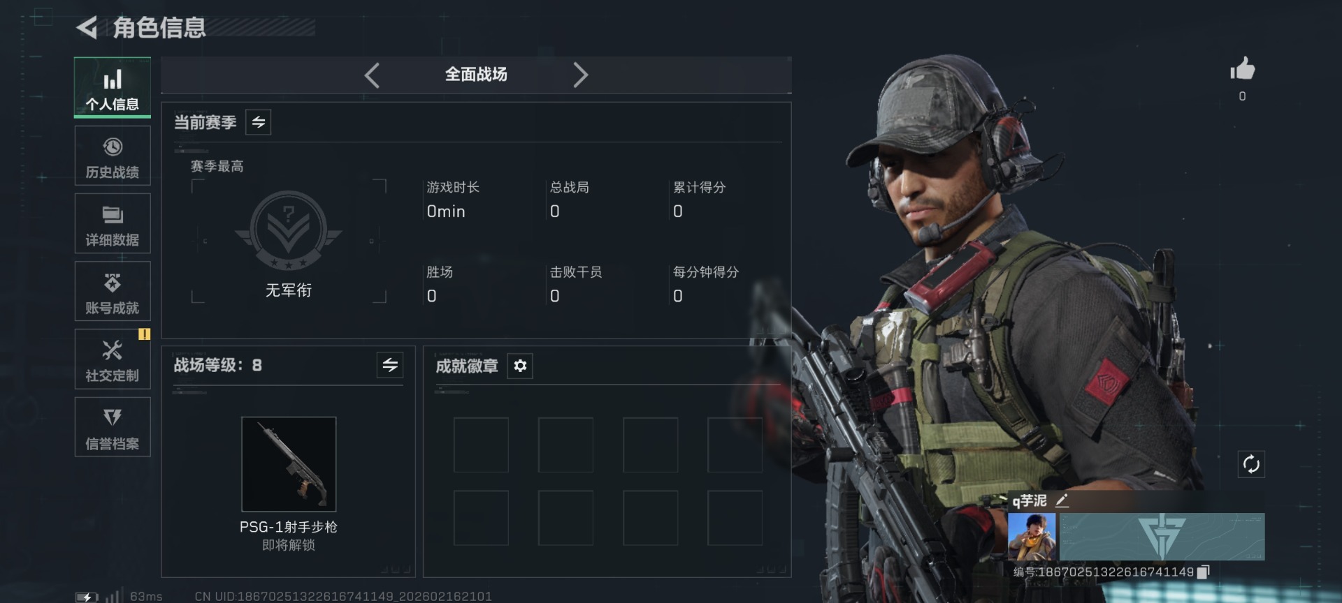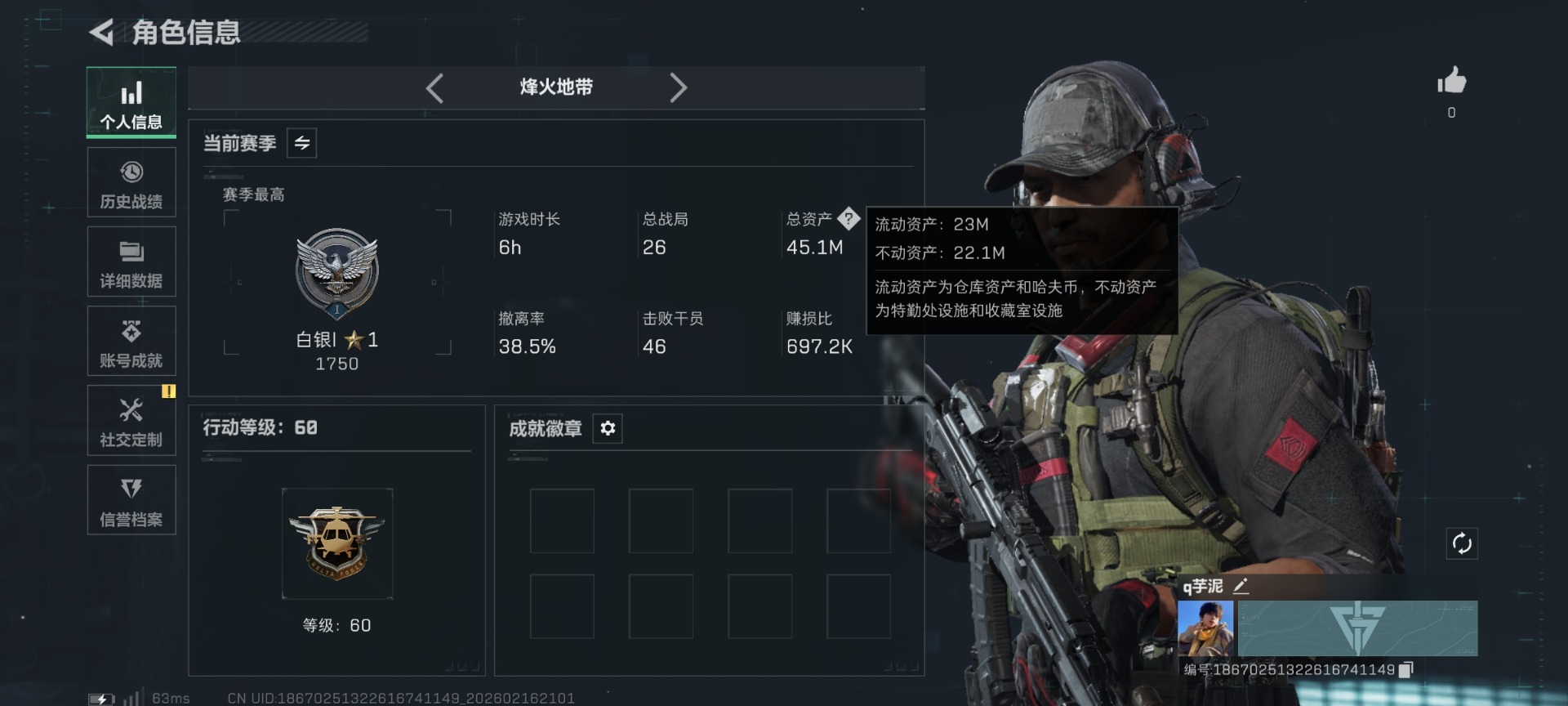 []总资产:45.1M 1传说枪械 哈夫币:765.372K 不可修改实名 【烽火地带段位】白银 【全面战场段位】无段位 【传说武器皮肤】SKS射手步枪-骑士
