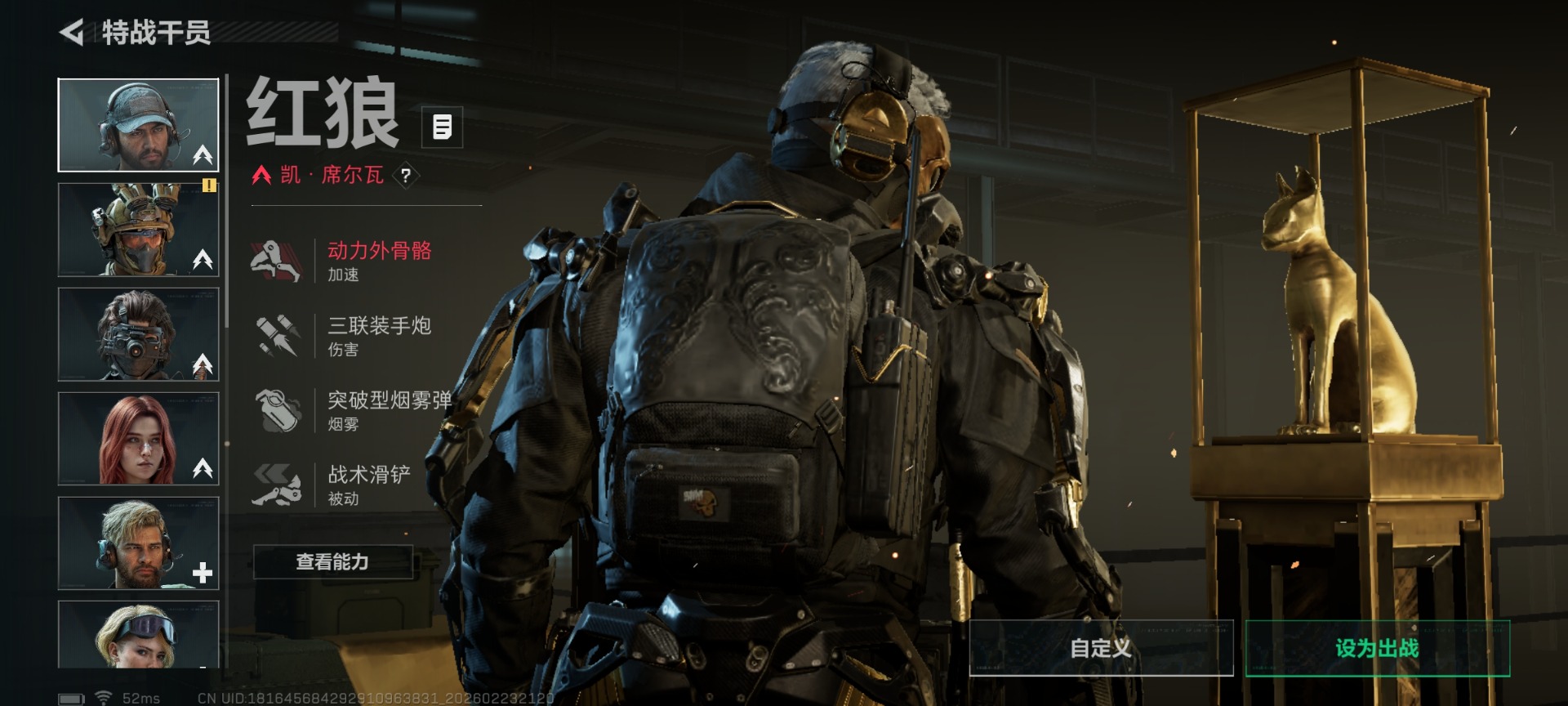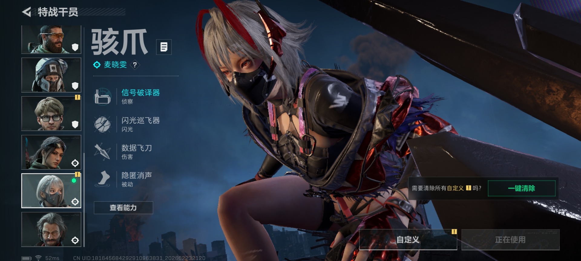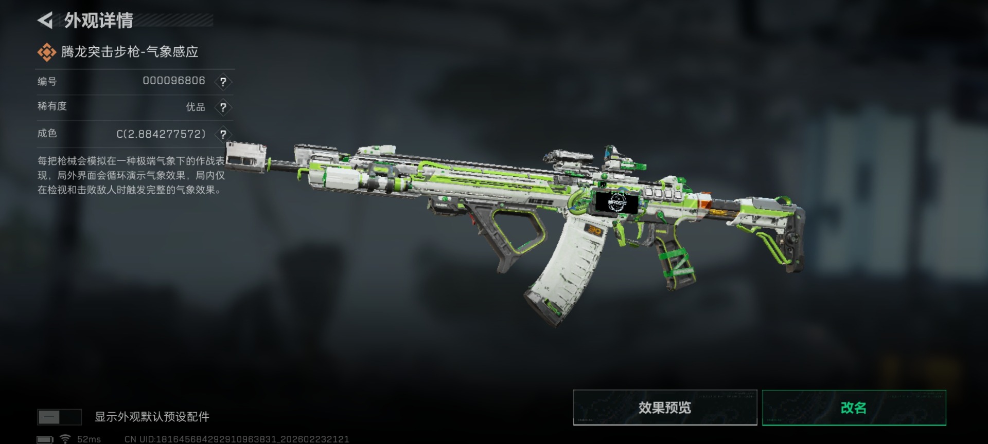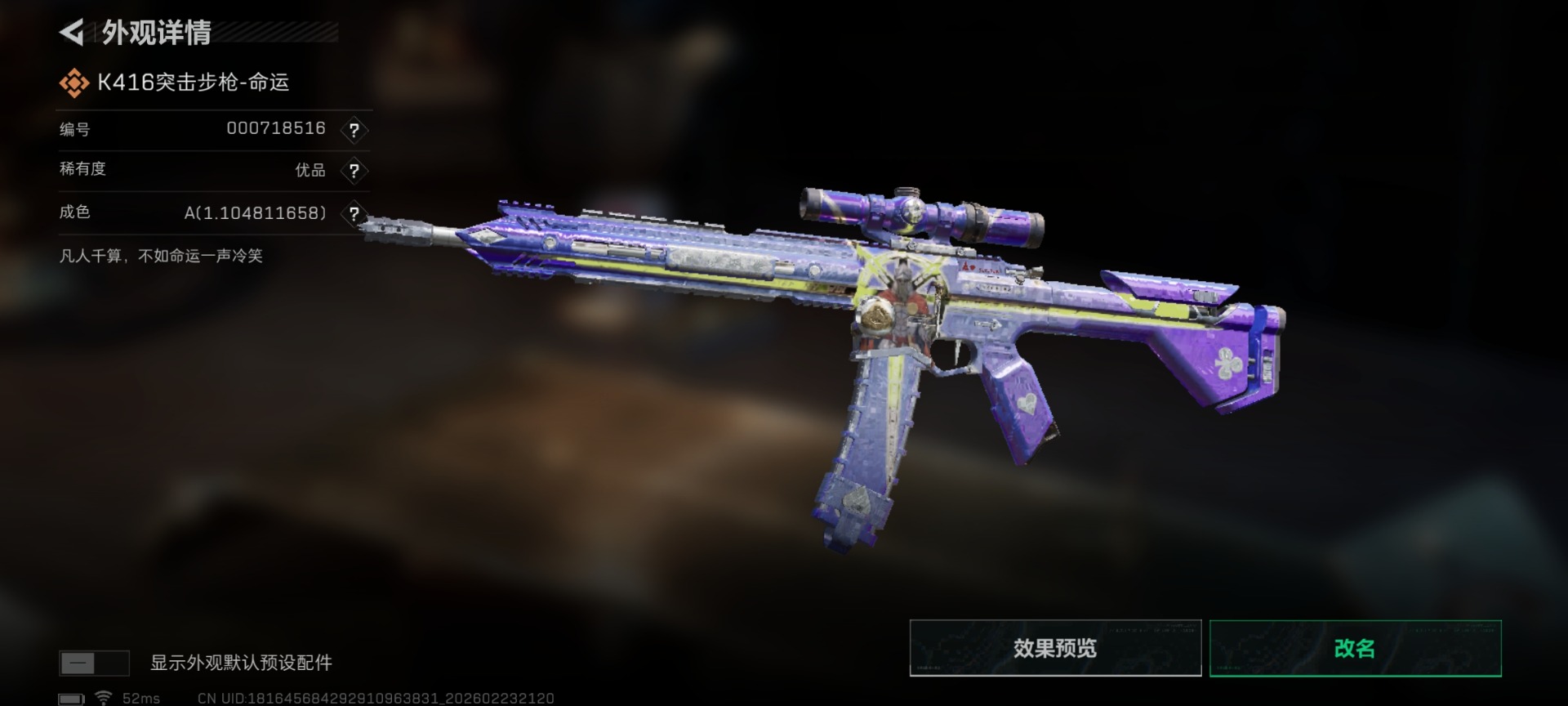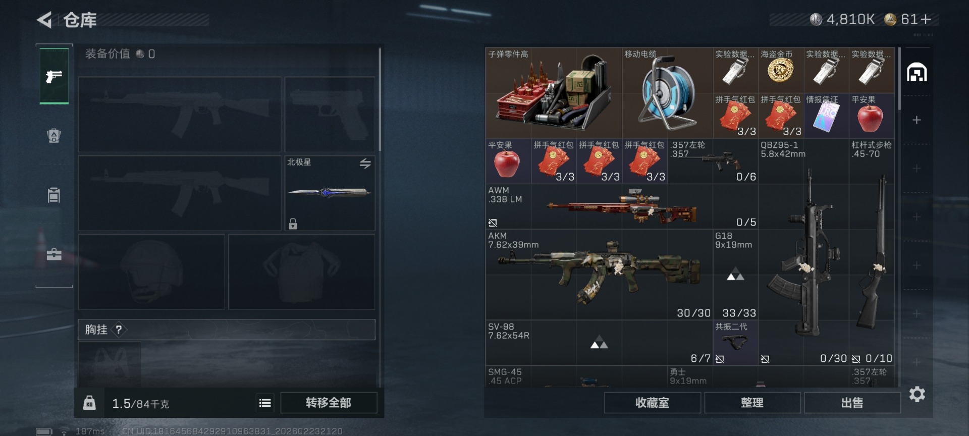 []总资产:106M 3干员外观 1近战传说 35传说枪械 哈夫币:4.810K 不可修改实名 【烽火地带段位】钻石 【全面战场段位】上等兵 【干员外观】红狼-蚀金玫瑰,露娜-黑·天际线,骇爪-维什戴尔 【传说武器皮肤】近战-北极星,腾龙突击步枪-气象感应(典藏),K416突击步