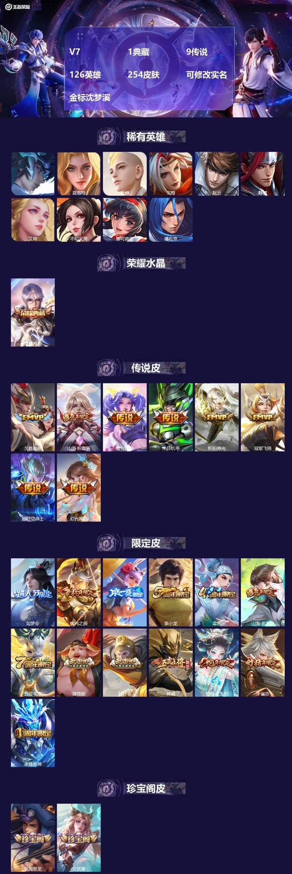 [17166364]V7 1典藏 9传说 126英雄 254皮肤 可修改实名 金标沈梦溪 【英雄全皮】猪八戒全皮,大禹全皮 【稀有英雄】大司命,韩信(韩跳跳),夏洛特(夏师傅),艾琳,橘右京(橘子),娜可露露(鸟人),不知火舞,赵云,金蝉(唐僧),戈娅 【荣耀水晶】星域神启(倪克斯贼亮) 【传说皮】幻光神枪,山海·炽霜斩(李信年限),末日机甲-孙尚香(绿蚂蚱),冠军飞将,久胜战神,炽阳神光,超时空战士-狄仁杰,音你闪耀(rap皮) 【珍宝阁皮】女武神,玩趣恶龙 【赛季/战令皮】古海寻踪(s33),海盐诗旅(s30),擒涛扼浪(s31),潮玩骑兵,奇幻香踪,探海日志(s32)