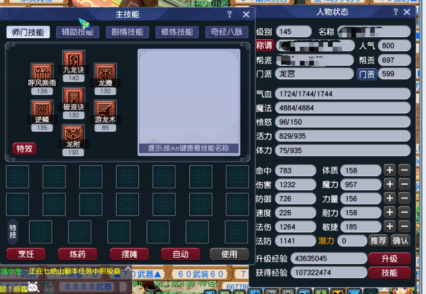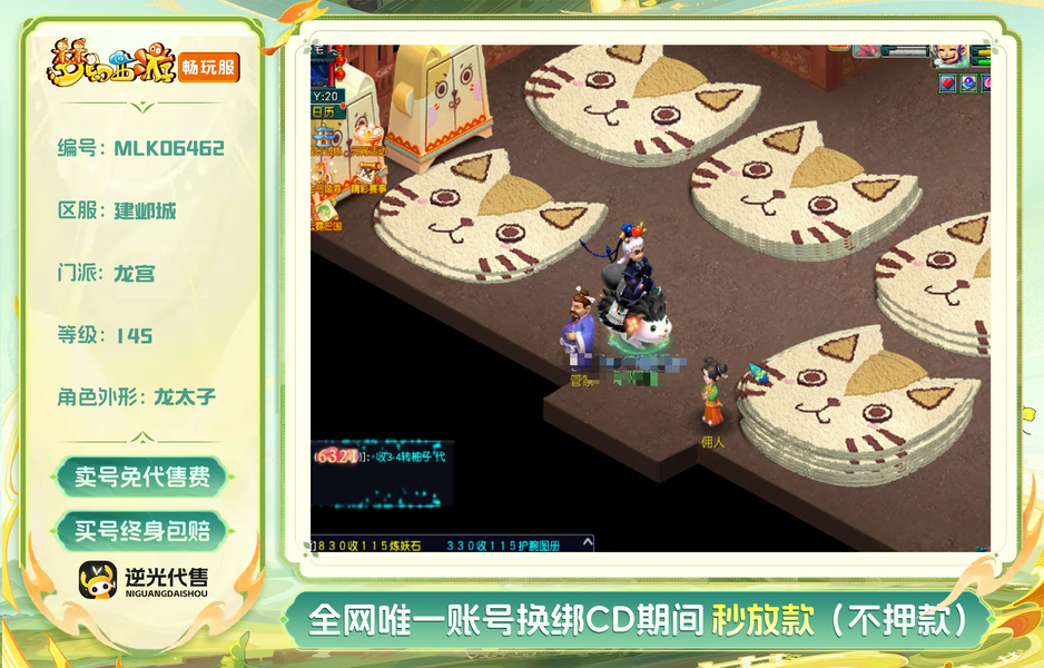 准飞升145龙宫一手号,有一套豪宅+家具。自带一套动物套装备跟修练16上手就能玩。练药等级134,已交第一炼药帮学费可直接弄帮贡学到最高级。