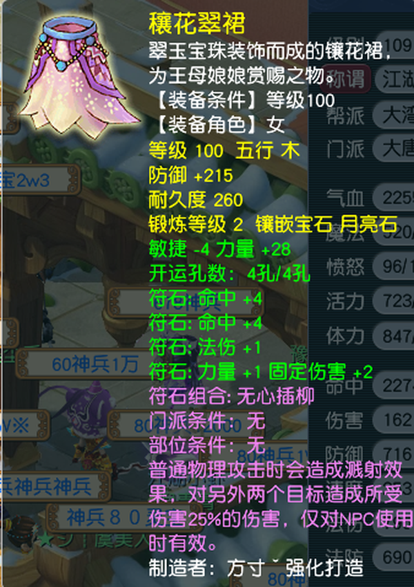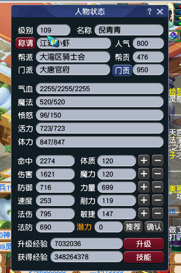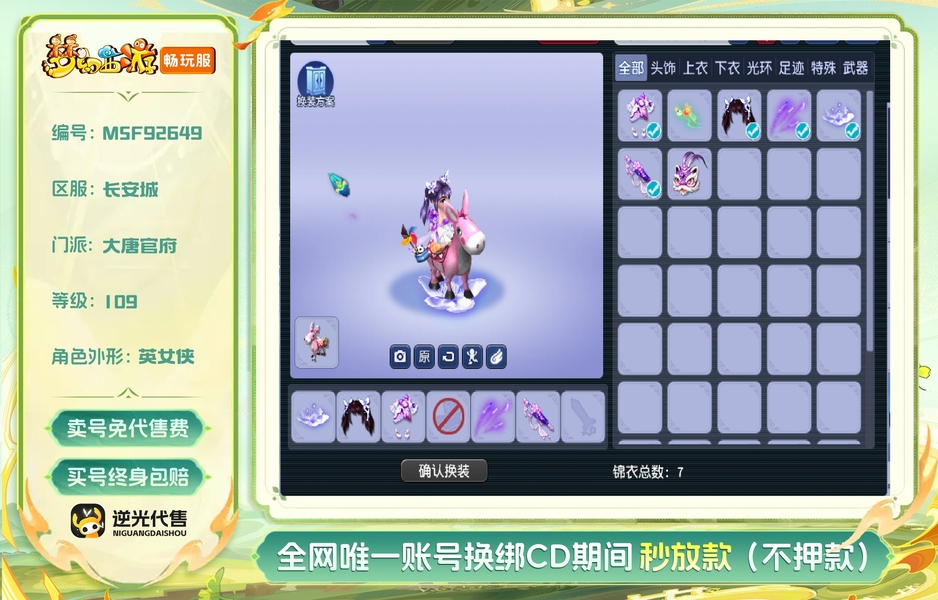 长安城109顶级女大唐,面板没有打过任何符,3件80杀气套,高伤害武器,100级4孔溅射,满技能满修,仓库没清过很多宝石环,自己的一手号,没有换绑cd
