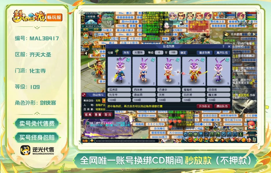 齐天大圣5门,5⭐神游太虚随便打,家里不让玩了,自己的一手号, 5个号在一个帮,修炼随便点,仓库没清, 售后方面包一切