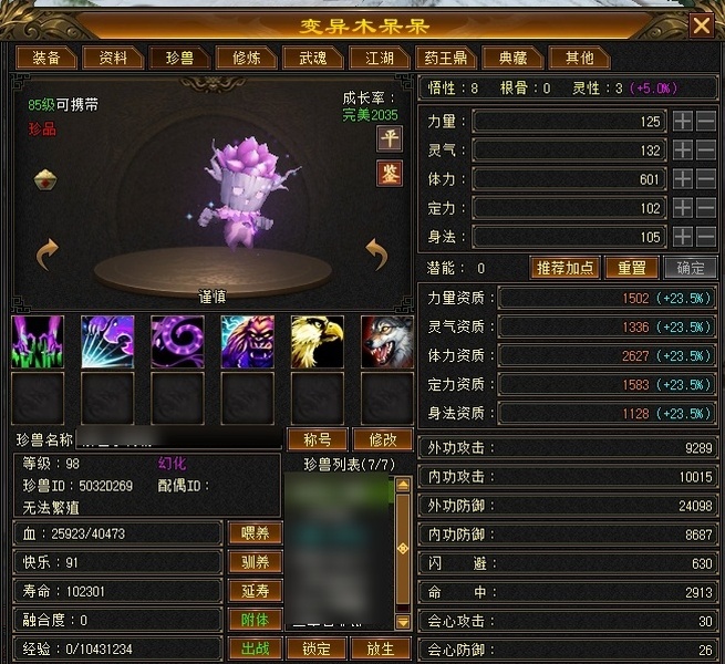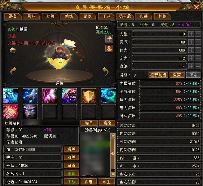 可配合上格子,一手号。彻底脱坑已降价到底,随缘吧。不开鼎状态,42万裸血,绝版紫仙侣,稀有豹纹墨羽潜幽,完美武魂暗器,四抗,付费图鉴一直更新自己看,自己看细节吧
