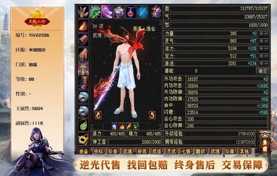88组身法第一人,闪避比七级号高,换个4316身法附体起飞,三排极品灵武,8雕六精绘,永久坐骑金乌,
