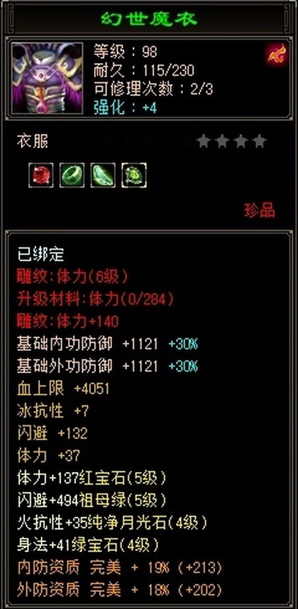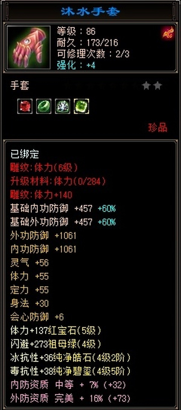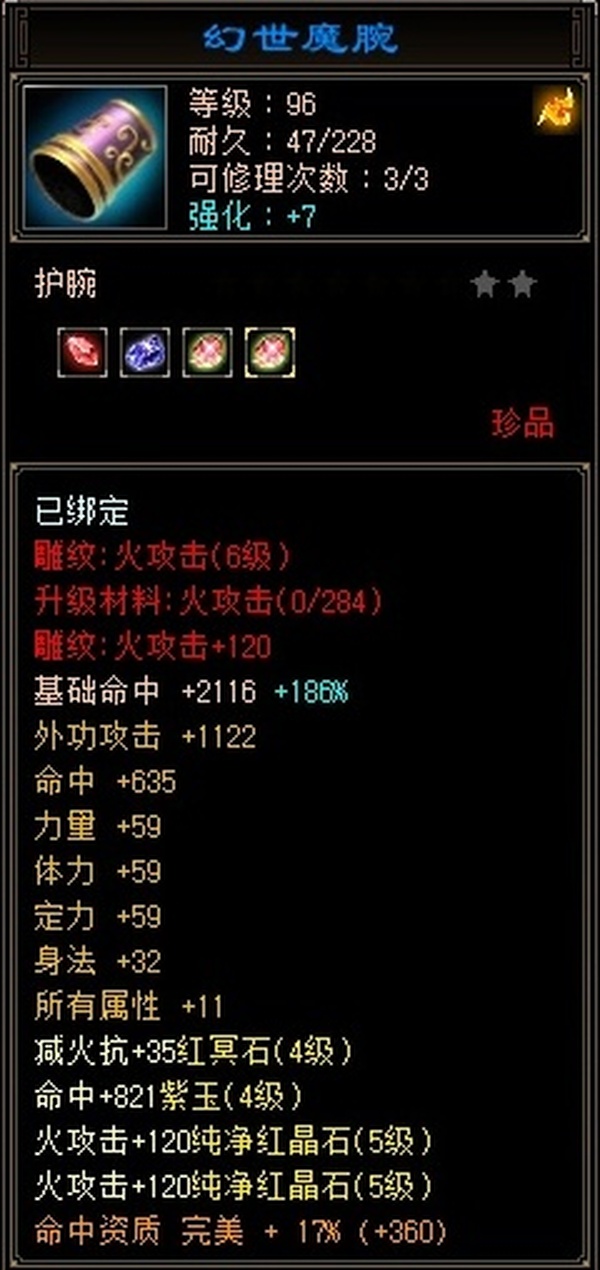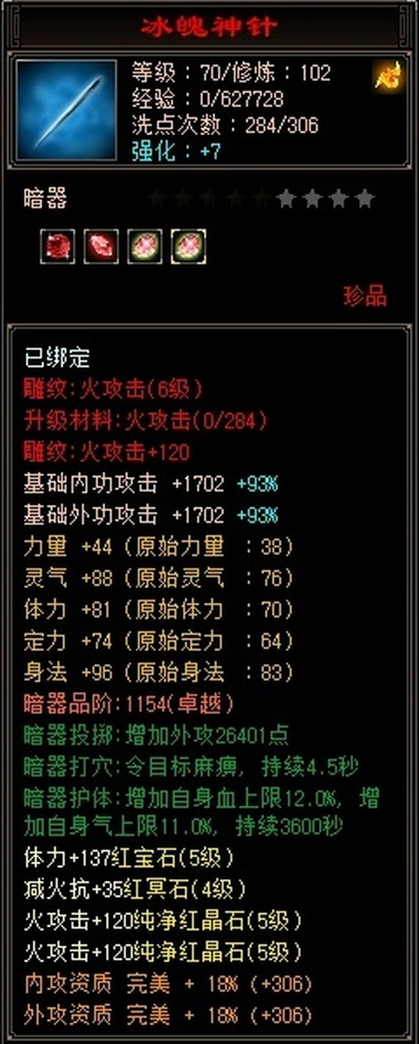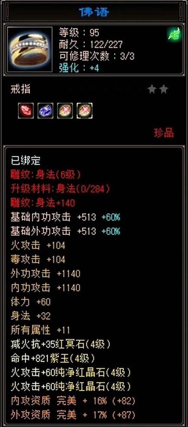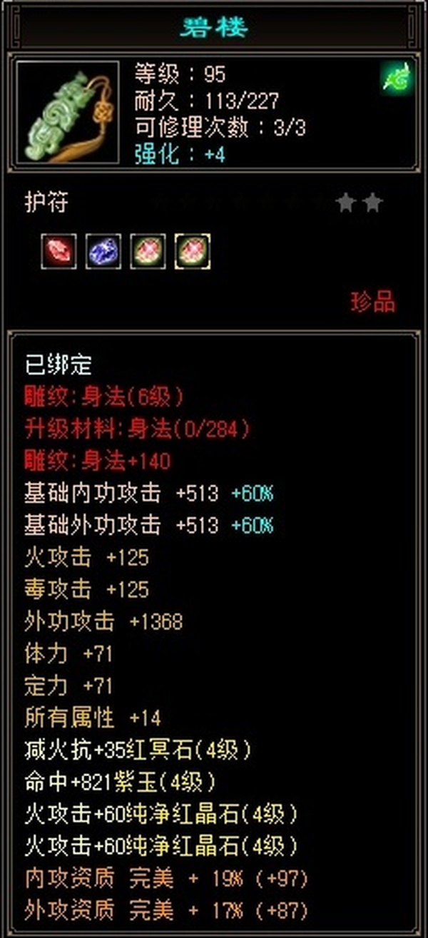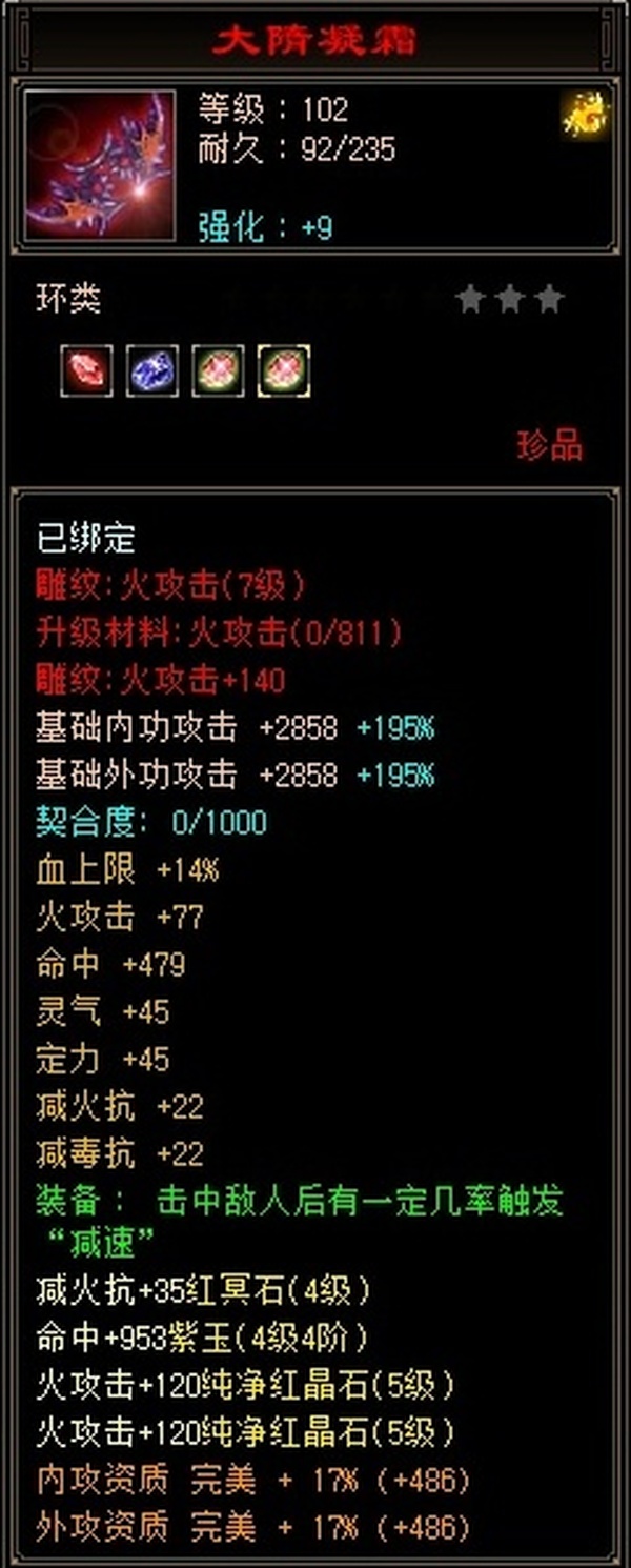 全部4级减抗:火减抗344,毒减99, 裸火属性2957,毒属性772,26w血量, 所有装备四孔全开, 雕文全齐 到手直接玩