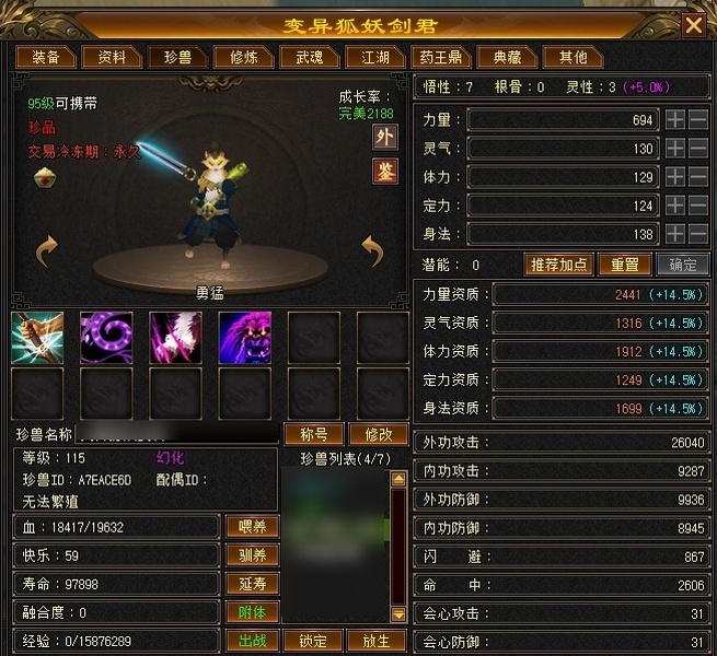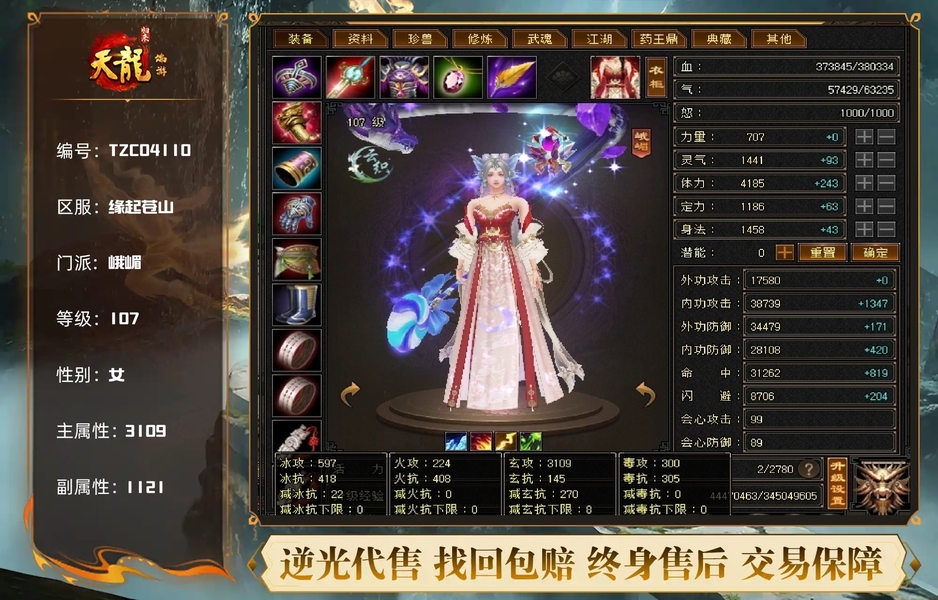 充值3万+,带狐狸坐骑,从开区玩到现在,最新付费、D4活动、心魔图鉴全部拉满,基本满5,38万血,带可交易40附体,3000+属性,近4万内功、3万+命中,冰抗、火炕均400+,毒抗300+,5级号直接抗死,各类宝石仓库也准备好了,随时可以根据敌人属性更换抗性,玩起来很舒服,性价比极高,等级心法修炼都在榜上,什么都不缺。