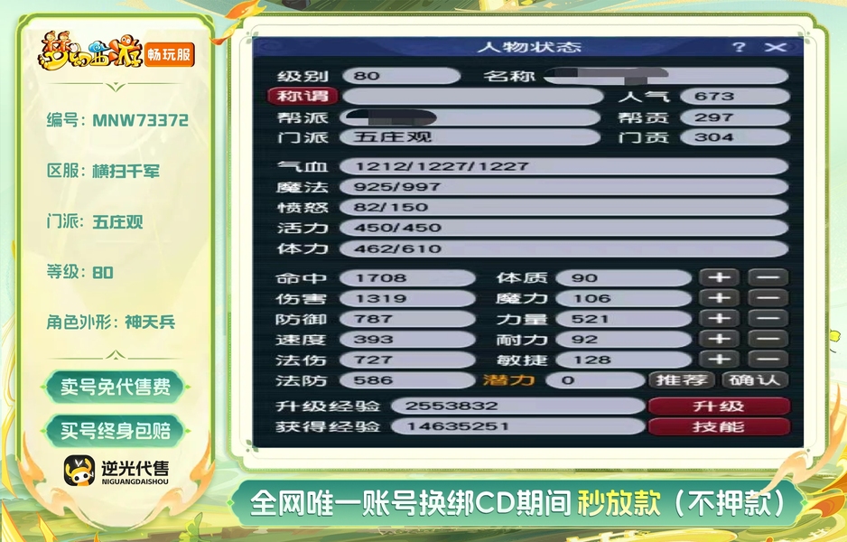 1五庄+4普陀,顶级配置,副本,任务等,挂机通刷,4普陀配置差不多,不一一上图了。含4000多免费仙玉,全部带武器装备,法宝,天阵,飞行,并且带封妖高速芙蓉宝宝等。买到,即可上手玩,无需购买东西。优质刷子组合号,月入三千不是梦。没时间玩了,甩号了。