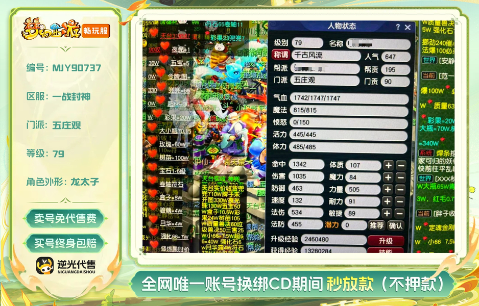 全套三国 锦衣 方天画戟染白色 连体齐天大圣狮驼岭 69级 540绿通 就卖两天 持续刷经验中 带个70级破血项链价值4000万 新增晶清1200万随便卖