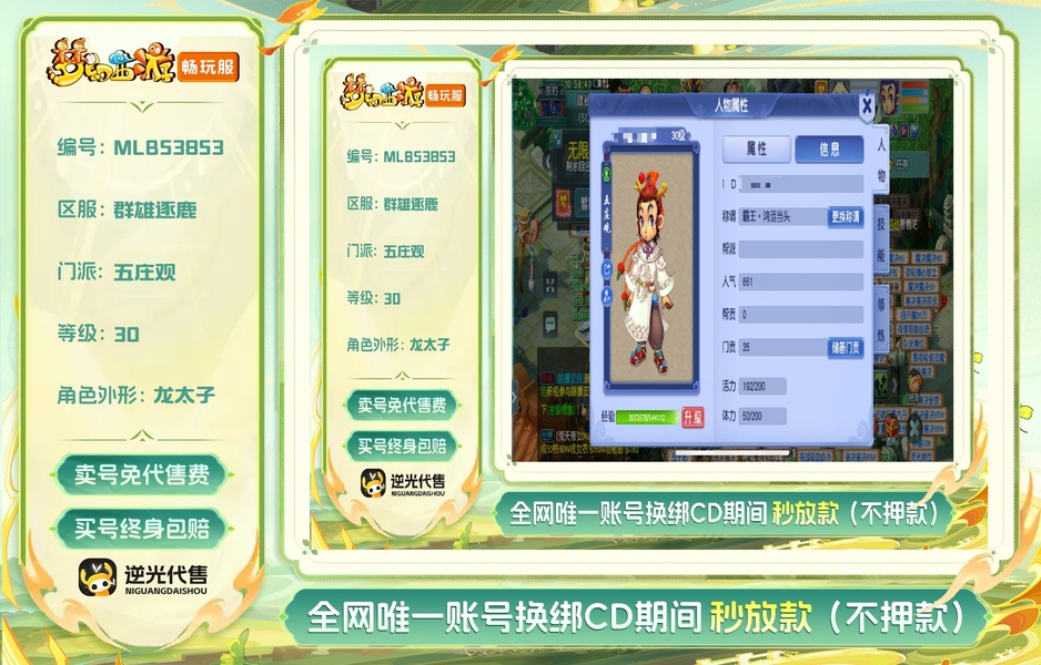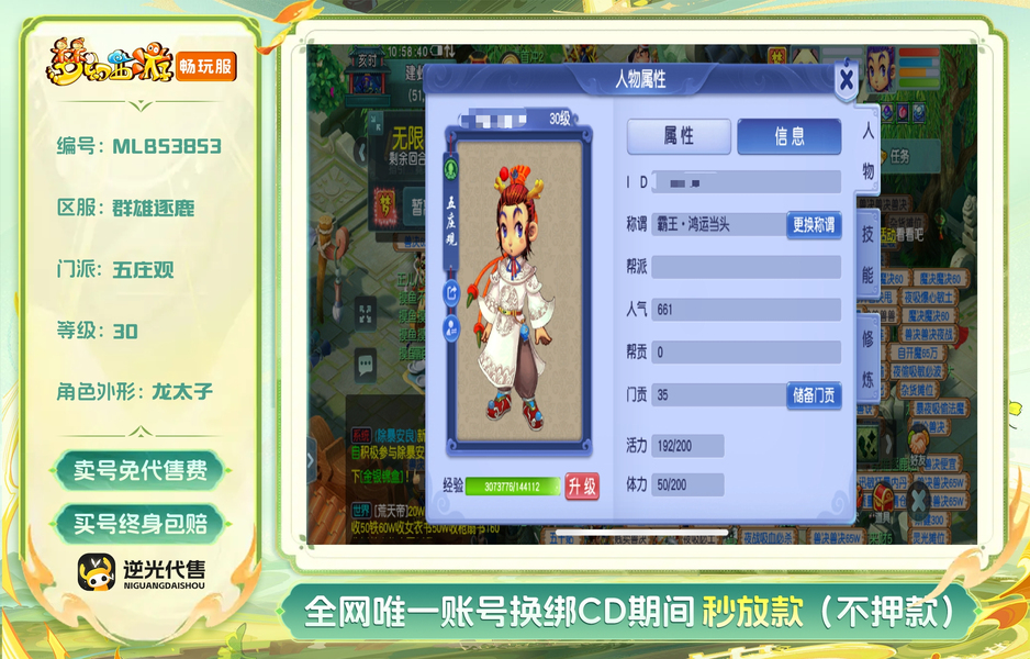 总经验:360万 | 等级:30 | 五庄观 | 无换绑CD | 180天尊享特权 | 男 | 【逆光代售卖号0手续费】【买号找回永久包赔】