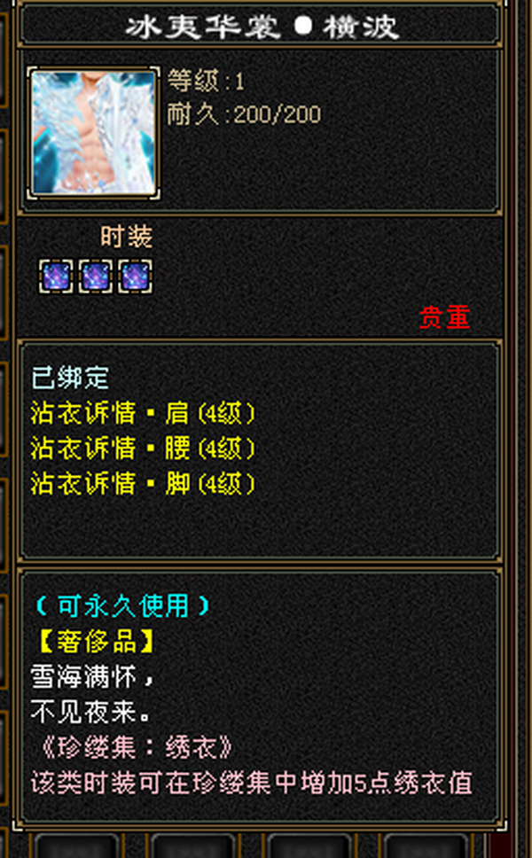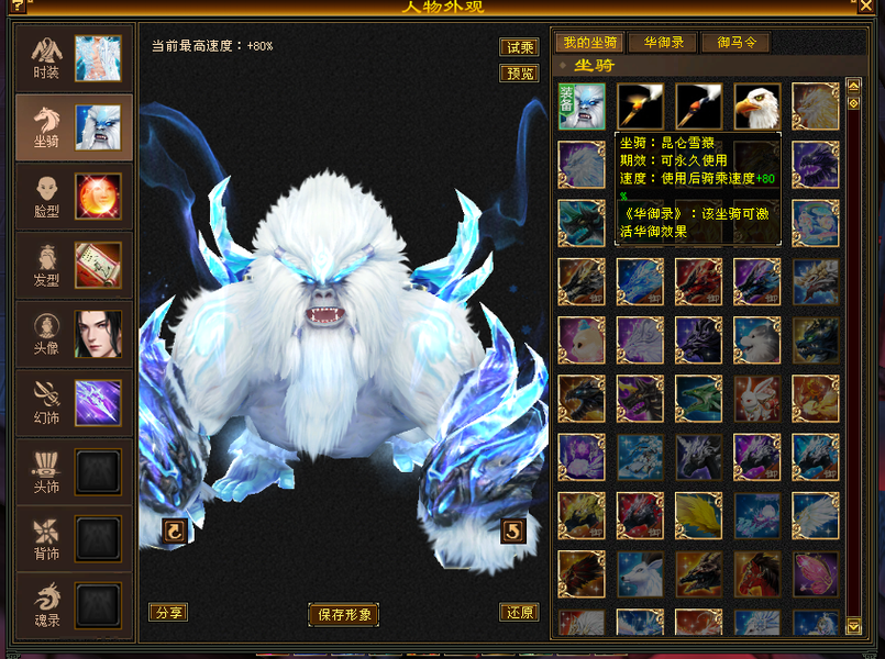 就卖一件衣服加4级配饰钱,花瓶、永久坐骑雪猿,主属性5300,主要就好看很帅,还有很大提升空间,