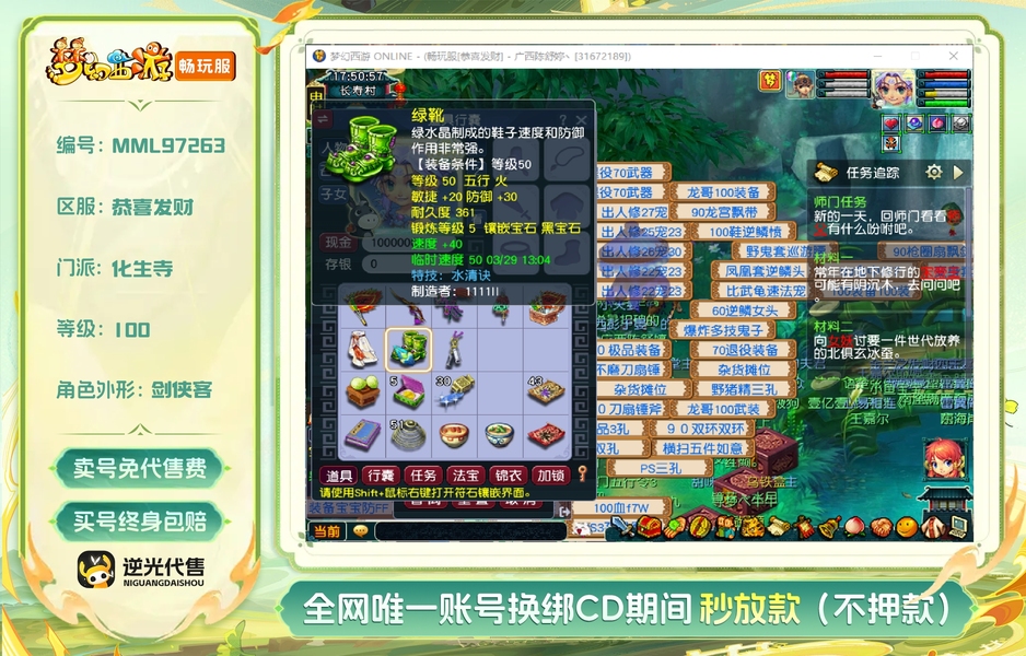 【MML97263】 | 总经验:3000万 | 等级:100 | 五庄观,龙宫,盘丝洞,魔王寨,化生寺 | 无换绑CD | 30天尊享特权 | 男 | 【逆光代售卖号0手续费】【买号找回永久包赔】