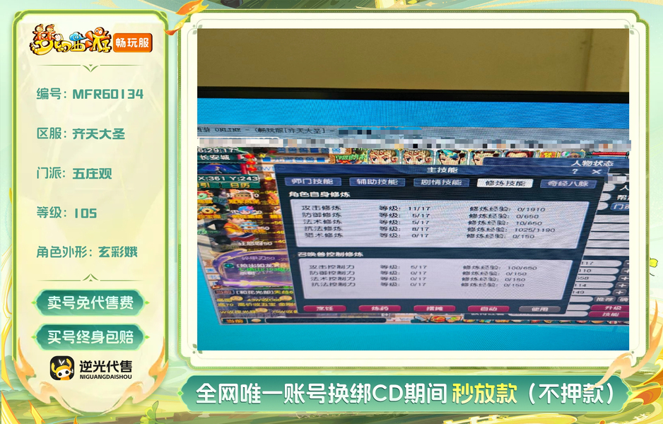 一五庄4普陀身上有3亿经验 五庄号上有8百万储备 普陀号上有1千4百万储备 有3个普陀还有6千多副本积分 有5只芙蓉 每个芙蓉有舍身击撞击内丹有20伤宝宝装备一套