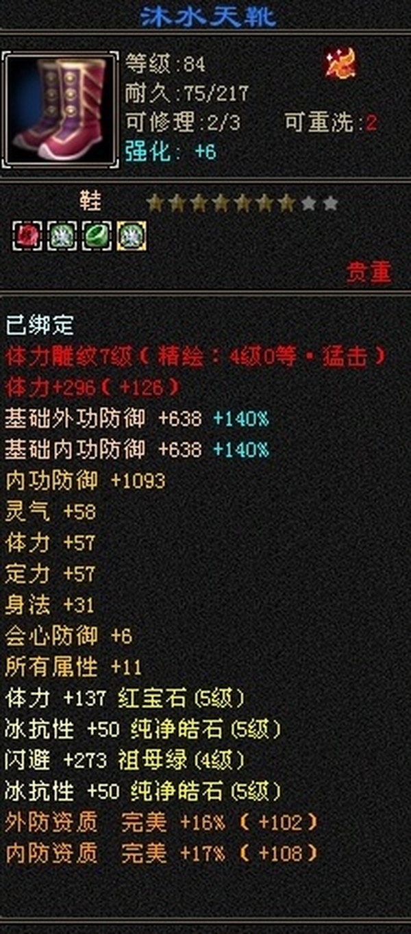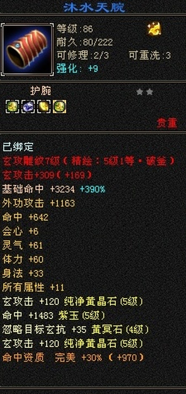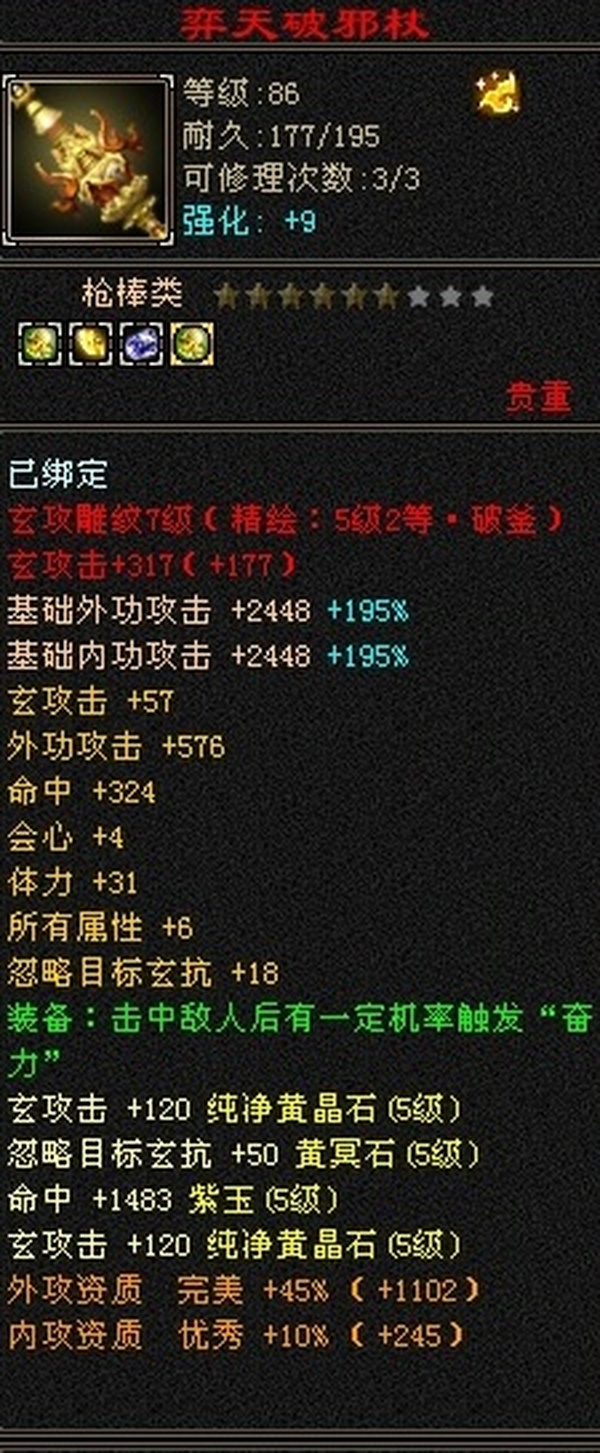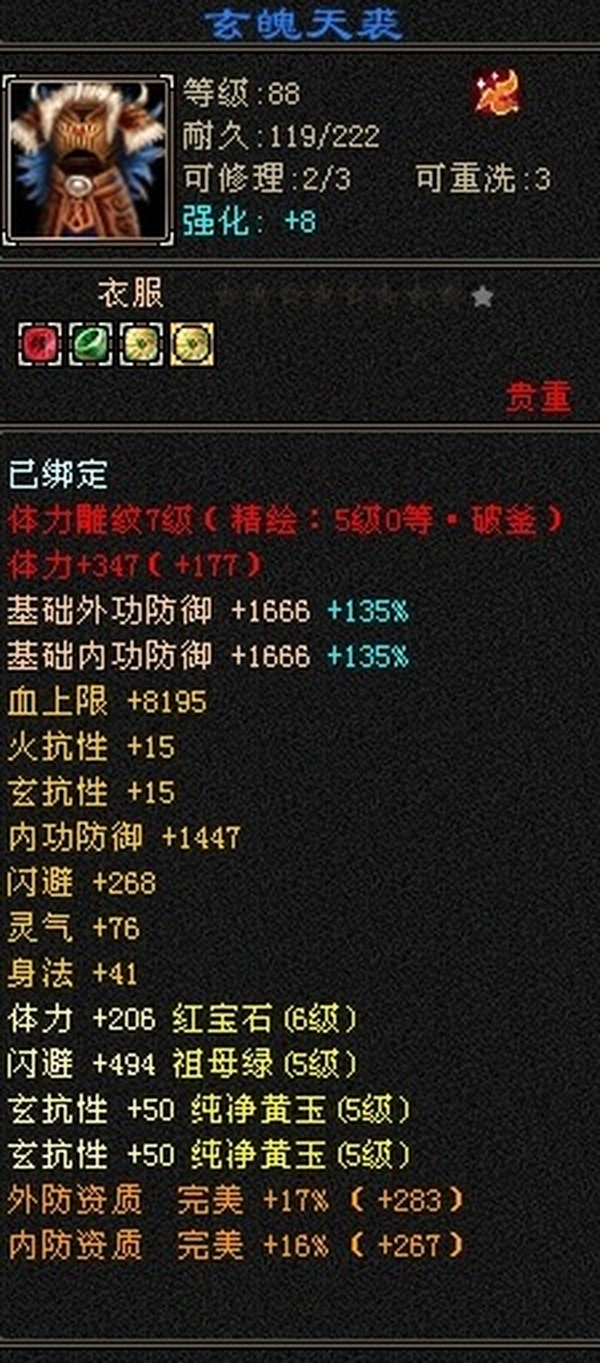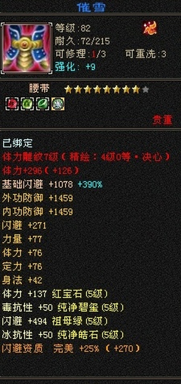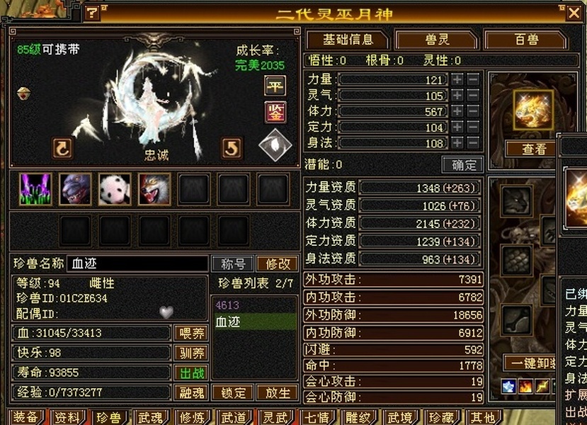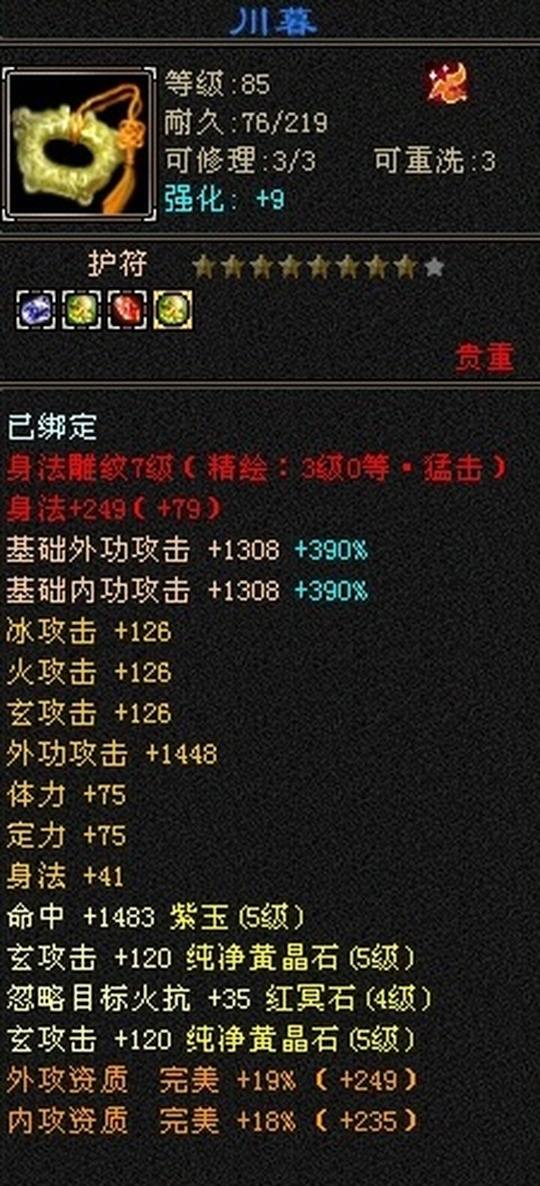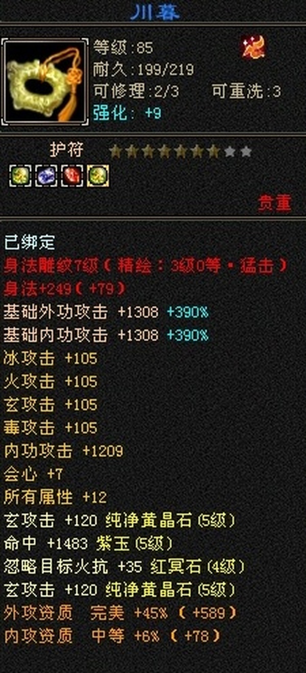 89极限5罗汉少林,总属性8705,外功5.3W;4属+外功,五修副本流少林,推怪巨疼,平均13W,暴击26,满状态寒玉谷平推有截图可看; 满7雕4径绘,4个精绘5级,带4颗6级石头;附体宝宝就值700了
