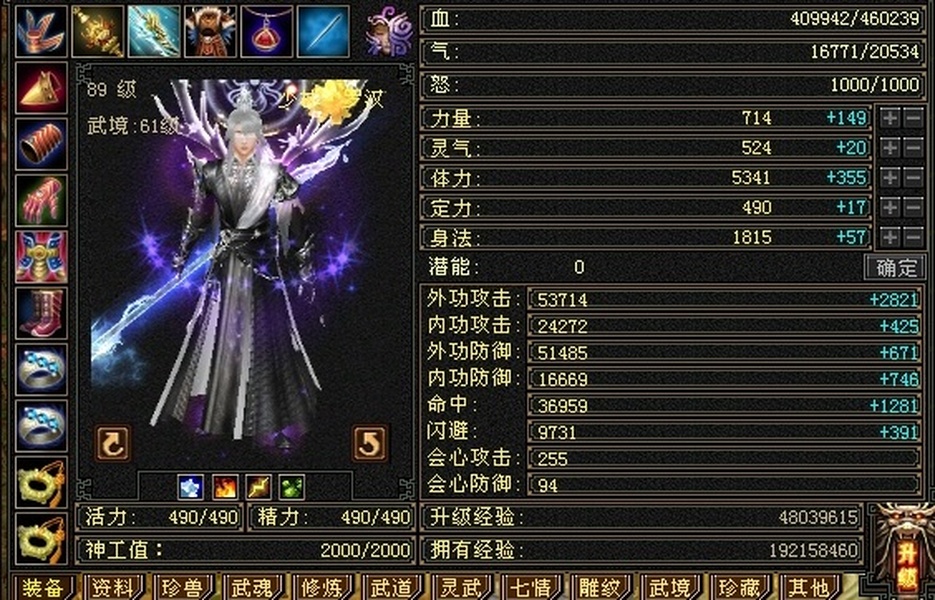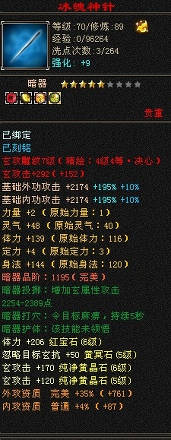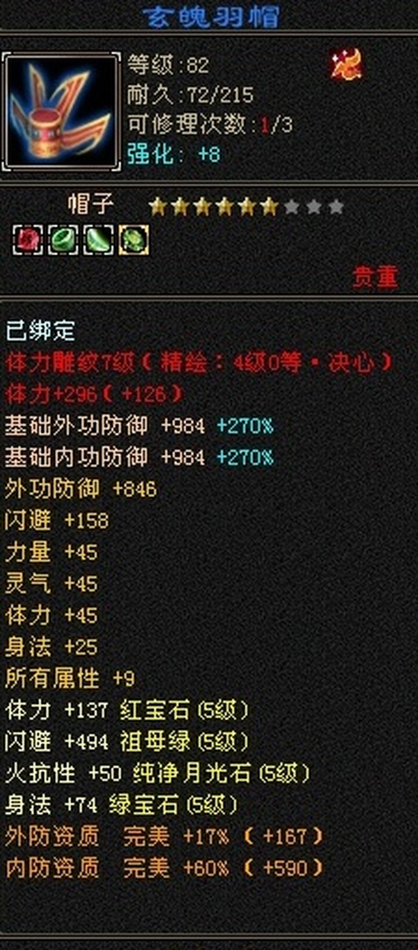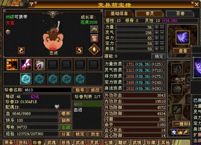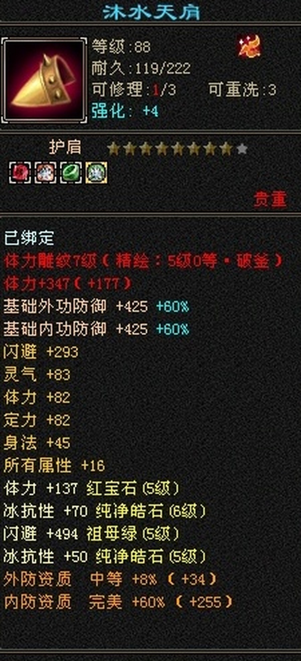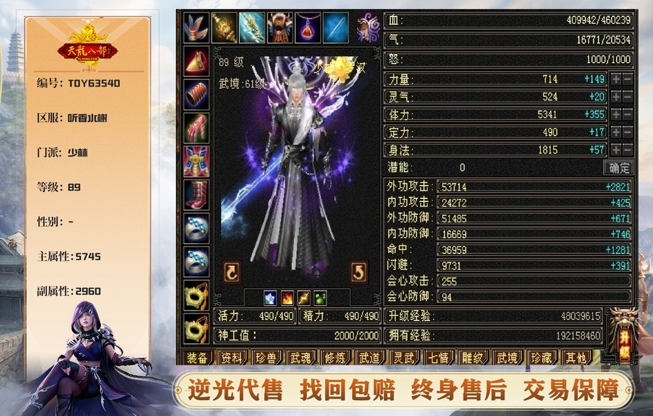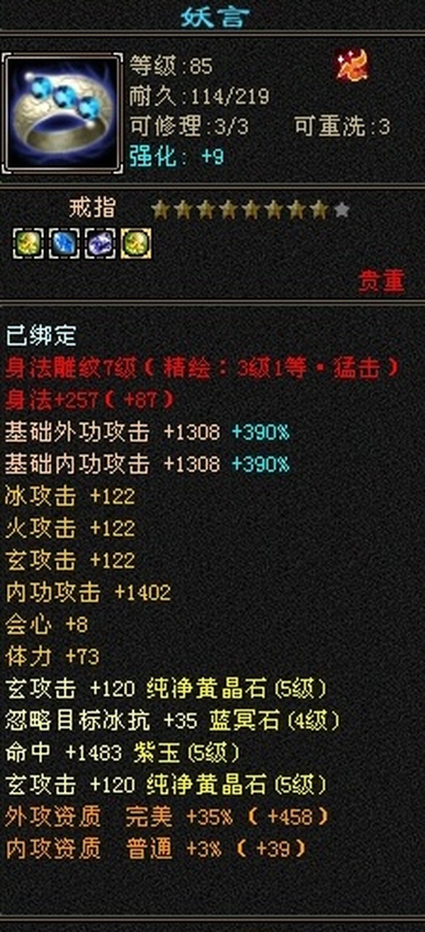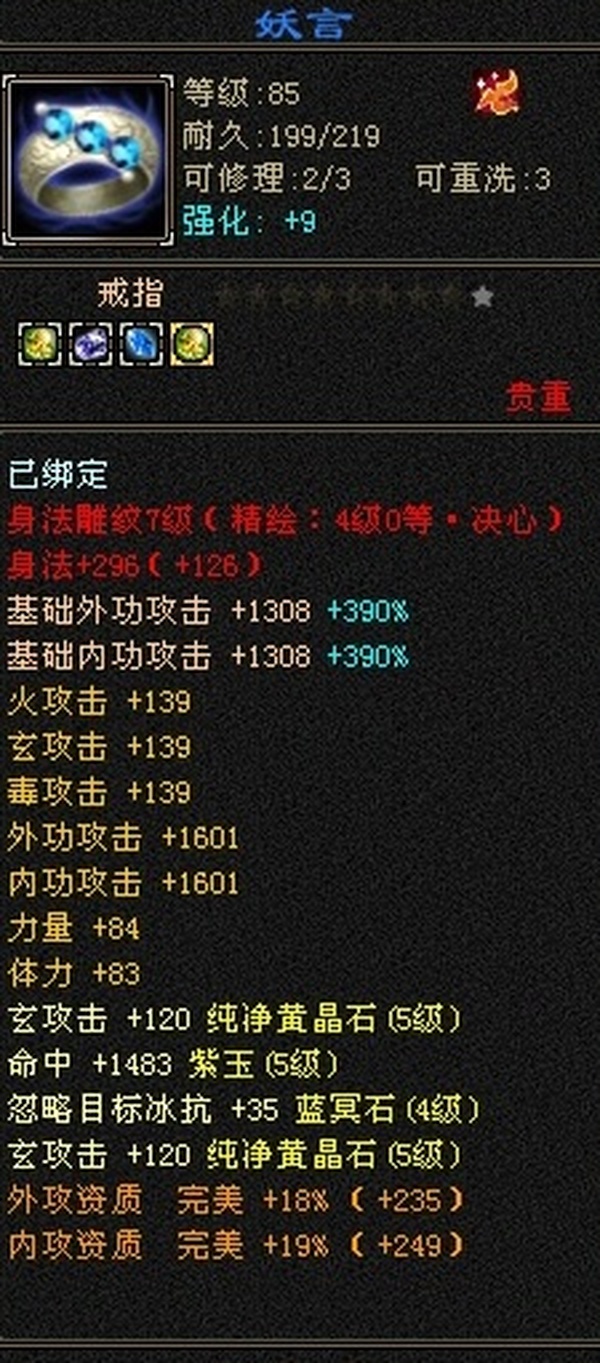 89极限5罗汉少林,总属性8705,外功5.3W;4属+外功,五修副本流少林,推怪巨疼,平均13W,暴击26,满状态寒玉谷平推有截图可看; 满7雕4径绘,4个精绘5级,带4颗6级石头;附体宝宝就值700了