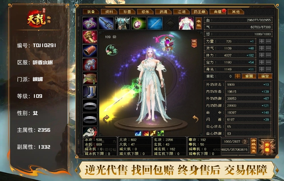 【TDJ10291】 | 峨嵋 | 等级:109 | 主属性:2356 | 副属性:1332 | 女 | 主玄攻
