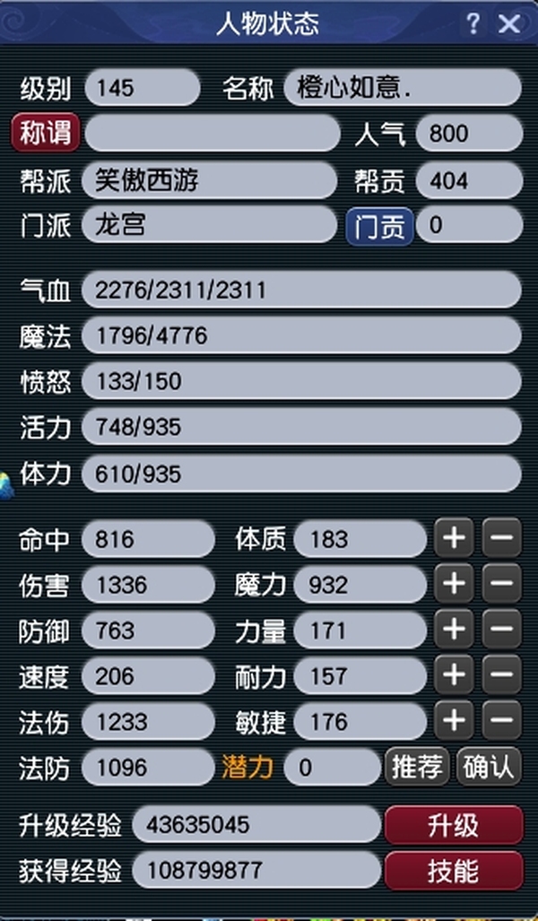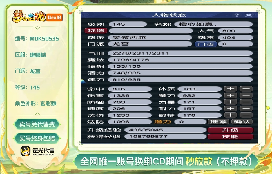 145成品号,可以跑环可以日常,4个技能130以上2个140以上,随时可以飞升,540绿通还剩121天