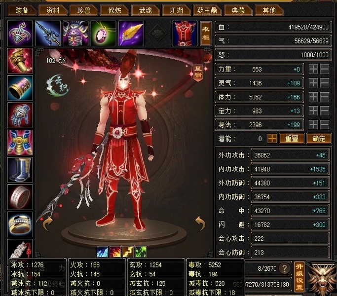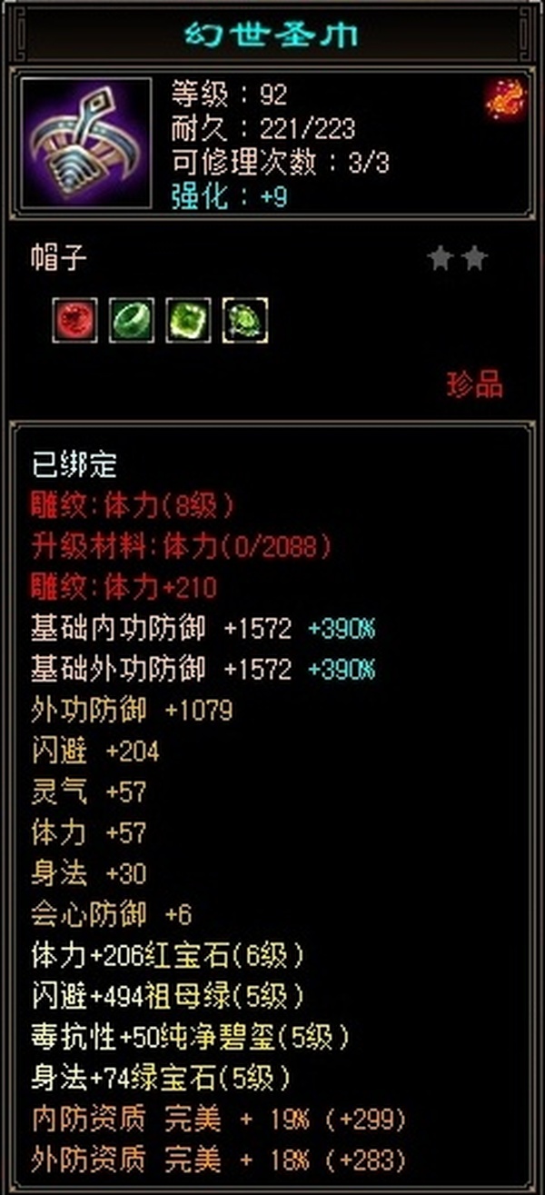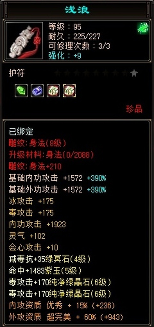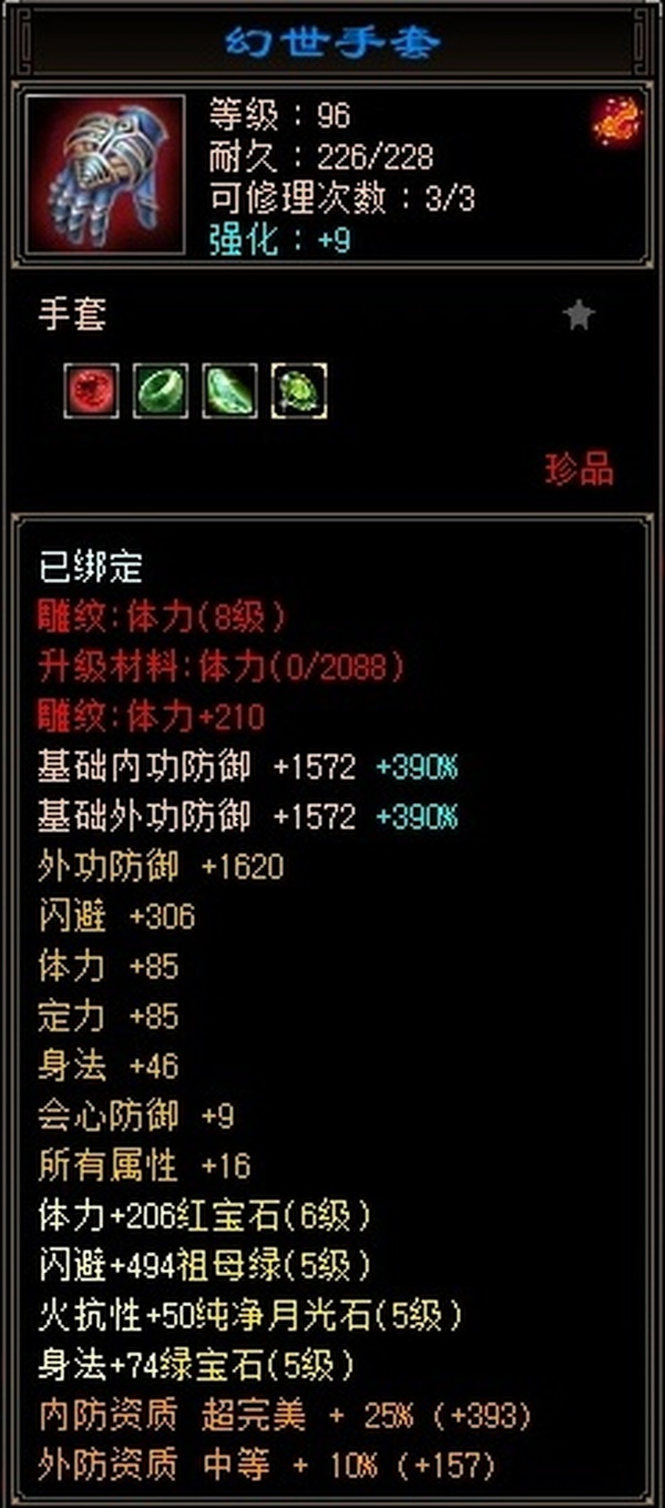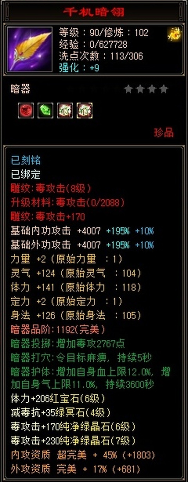 没时间玩儿了,满6体6属(还带颗7级毒),雕文满8,强化满9,包里还2颗6级毒攻,配饰3级,时装坐骑多多,每天持续更新中。。。