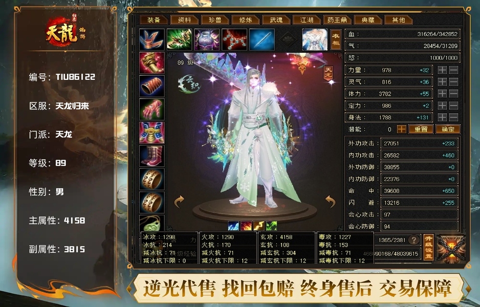 【TIU86122】 | 天龙 | 等级:89 | 主属性:4158 | 副属性:3815 | 男 | 主玄攻