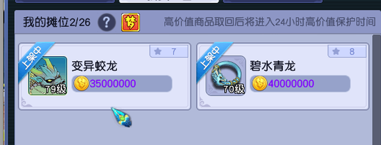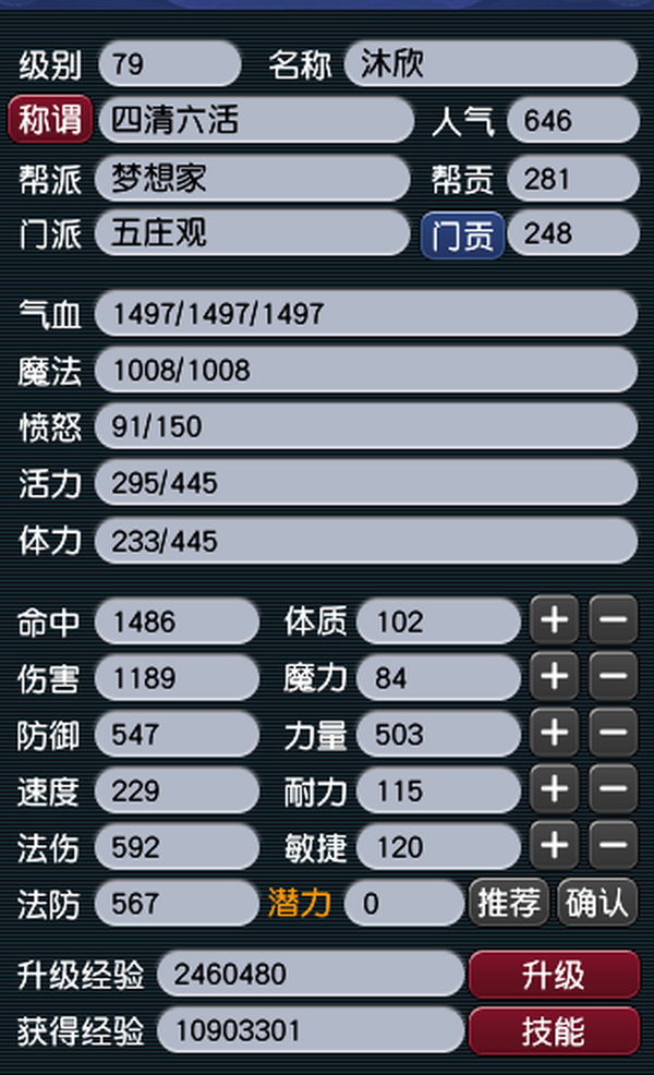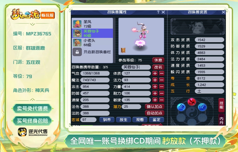 要忙工作了,不玩了,整号卖。什么东西都没清理,人环已卡好,珍宝阁上还有一条成品龙,一个变身70项链, 自己带的宝宝是成品芙蓉,加一只血敏凤凰,买下了直接可以玩,强身58,帮派第一天就加入了,过几天就可以点修了,仓库还有1-5段月亮石和黑宝石. 80的枪书和铁也备好了