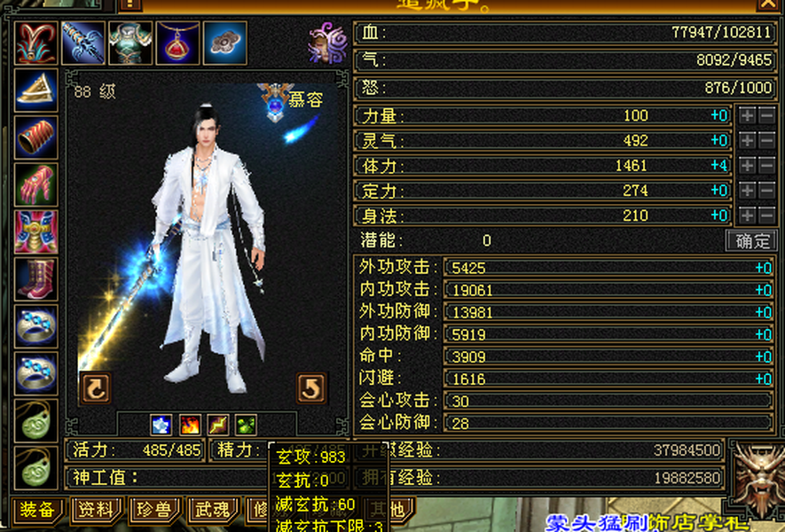 卡88级43混打内攻慕容 983属性1.9w内攻平推1.4-1.9 暗器武魂已开四孔