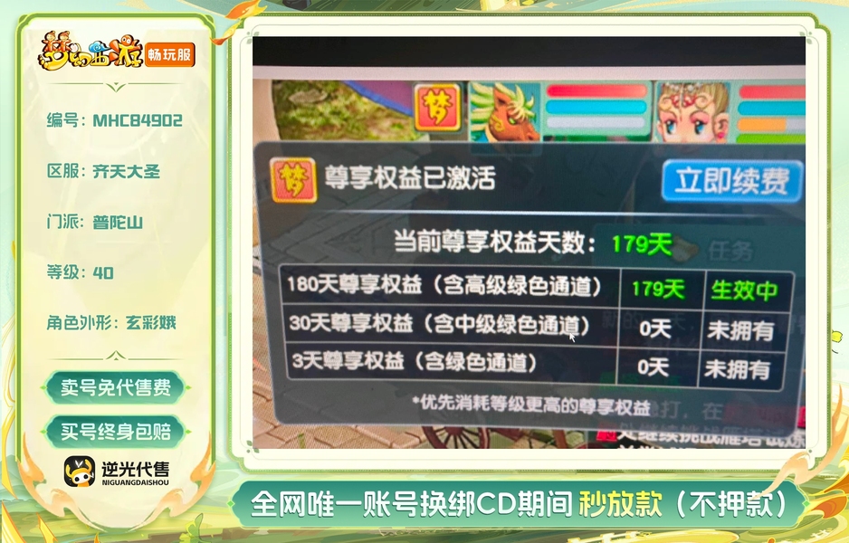 【MHC84902】 | 等级:40 | 普陀山 | 无换绑CD | 180天尊享特权 | 【逆光代售卖号0手续费】【买号找回永久包赔】