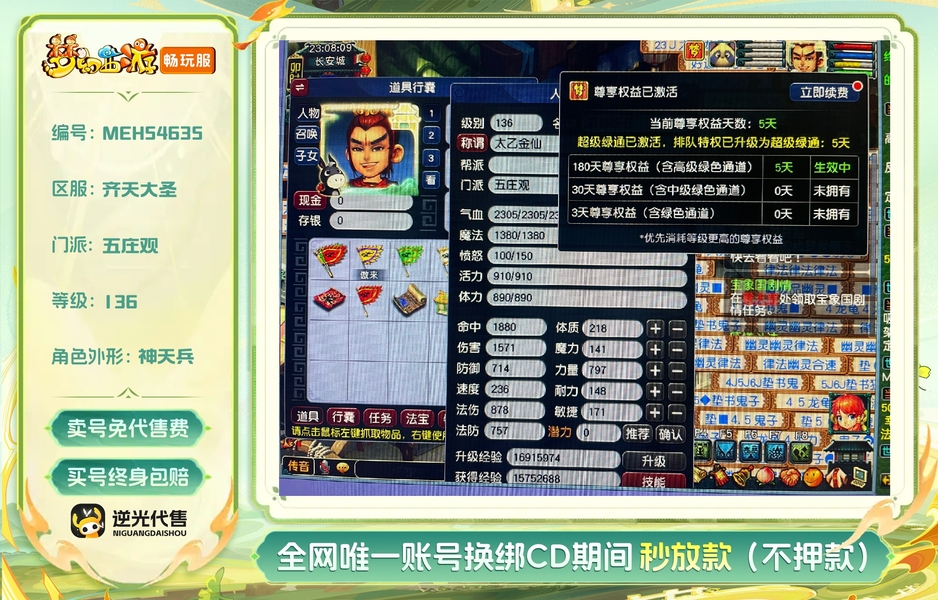 【MEH54635】 | 总经验:18万 | 等级:136 | 五庄观 | 无换绑CD | 超级绿通 | 男 | 【逆光代售卖号0手续费】【买号找回永久包赔】
