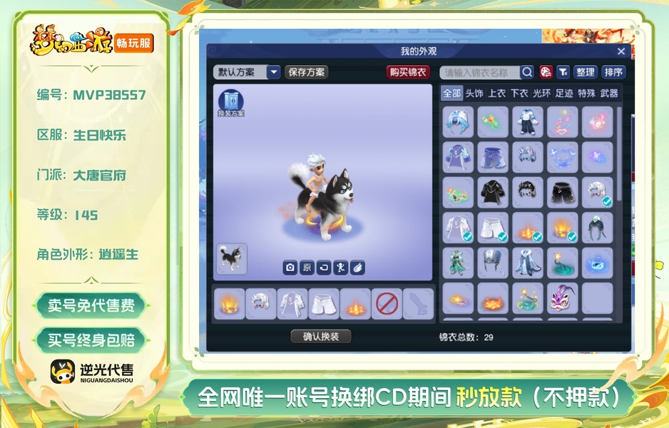 品质五门五开,第一批领先等级,还有15天开155.这组号啥都能打,非常效率,也可以单卖,但最好能一组带走。宝宝就一个2转筋斗云一个2转大鹏,其他都是四篮子鬼将。4个耐卡BB。将军令锁到时间24小时配合藏宝阁过户。