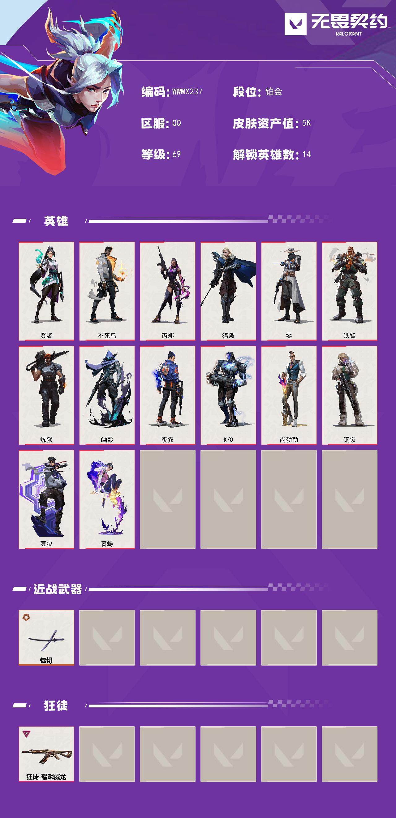 【WWMX237】【英雄】:贤者,不死鸟,芮娜,猎枭,零,铁臂,炼狱,幽影,夜露,K/O,尚勃勒,钢锁,壹决,暮蝶 【近战武器】:近战武器-镭切 【狂徒】:狂徒-耀鳞威龙 【卡面】:科迪亚钢铁 卡面 /贤者/不死鸟/芮娜/猎枭/零/铁臂/炼狱/幽影/夜露/K/O/尚勃勒/钢锁/壹决/暮蝶/近战武器-镭切/狂徒-耀鳞威龙/科迪亚钢铁卡面