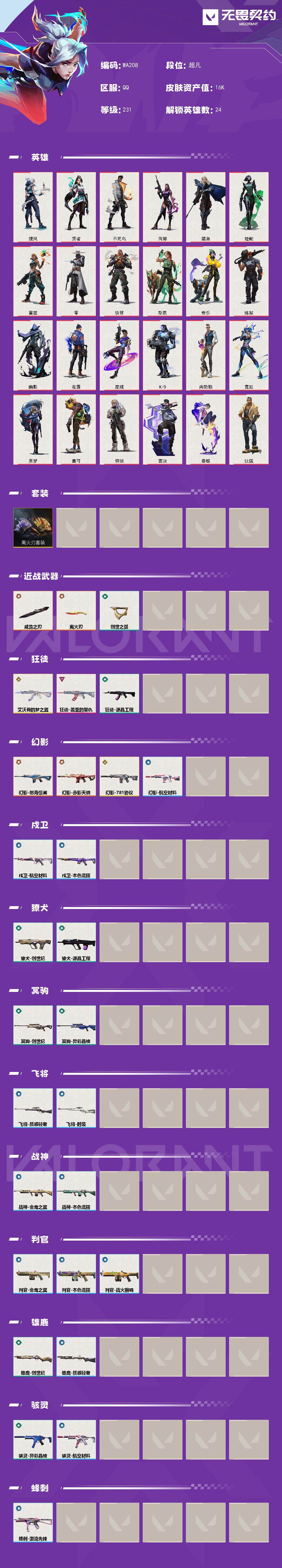 【英雄】:捷风,贤者,不死鸟,芮娜,猎枭,蝰蛇,雷兹,零,铁臂,斯凯,奇乐,炼狱,幽影,夜露,星礈,K/O,尚勃勒,霓虹,黑梦,盖可,钢锁,壹决,暮蝶,钛狐 【套装】:离火刃套装 【近战武器】:近战武器-威龙之刃,近战武器-离火刃,近战武器-创世之弧 【狂徒】:狂徒-艾沃莉的梦之翼,狂徒-盖亚的复仇,狂徒-源晶工程 【幻影】:幻影-怒海惊澜,幻影-赤影天骁,幻影-781协议,幻影-航空材料 【