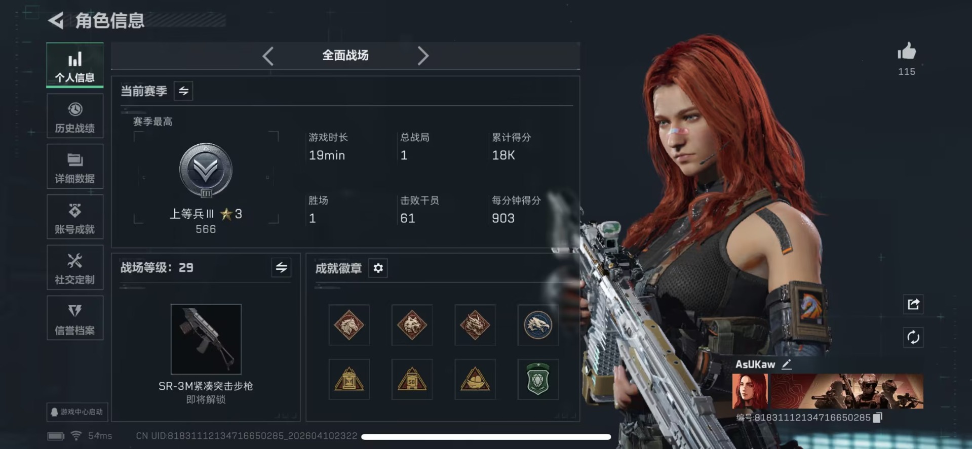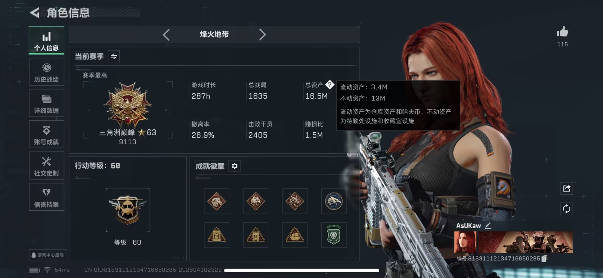[]总资产:16.5M 1干员外观 2近战传说 35传说枪械 哈夫币:451.242K 不可修改实名 【烽火地带段位】三角洲巅峰 【全面战场段位】上等兵 【干员外观】红狼-蚀金玫瑰 【传说武器皮肤】近战武器-处刑者,近战-信条,M7战斗步枪-棱镜攻势S2(典藏),AS Val突击