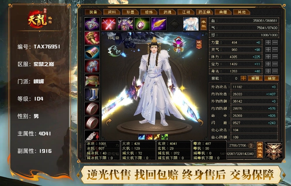 【TAX76951】 | 峨嵋 | 等级:104 | 主属性:4041 | 副属性:1916 | 男 | 主玄攻
