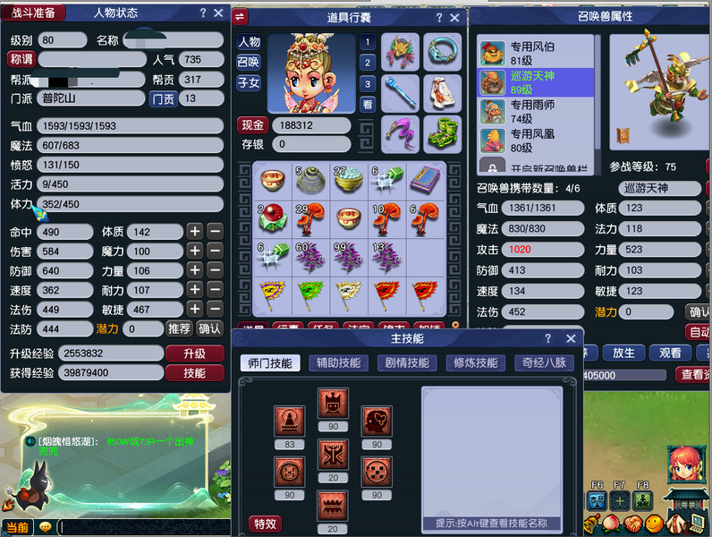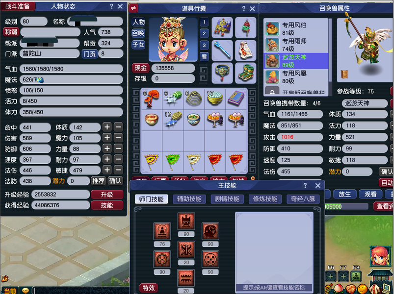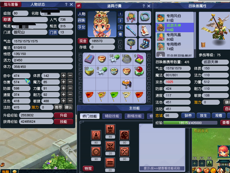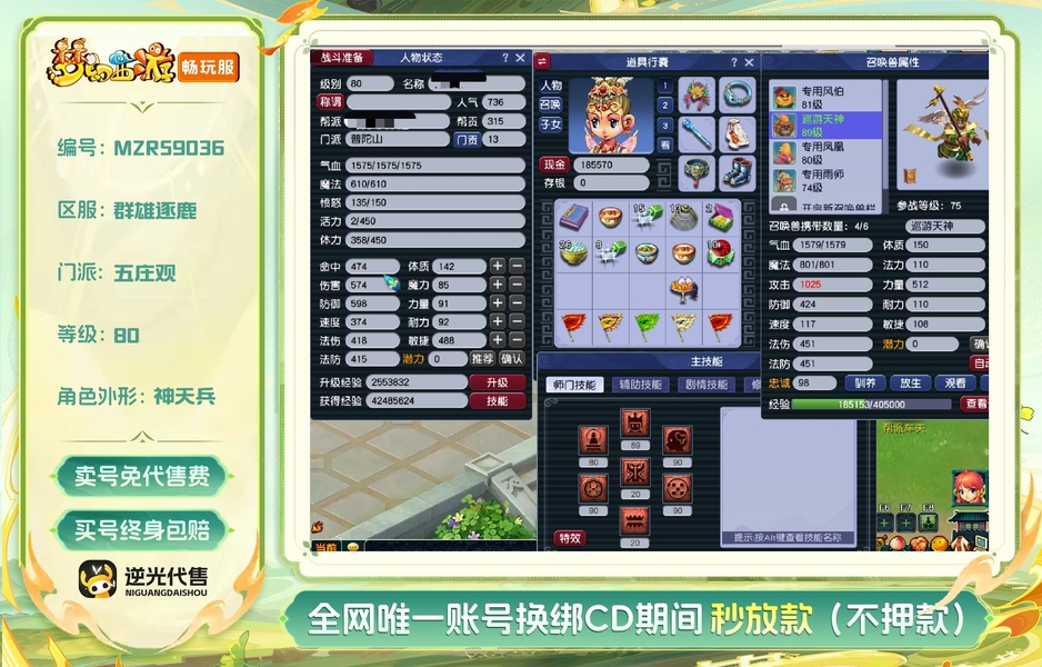 一组5开 一五庄4普陀 技能满 通刷 带一组巡游(高必夜战)工作原因没时间玩了。宝石3-4段,每天都有80环装。房子炼兽笼都有,所见即所得。