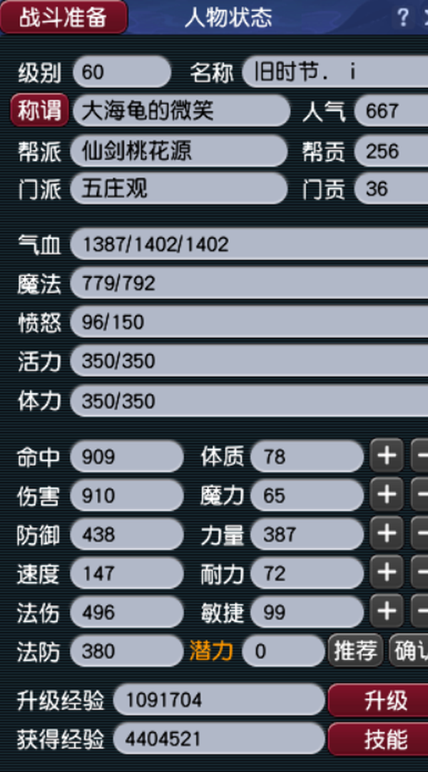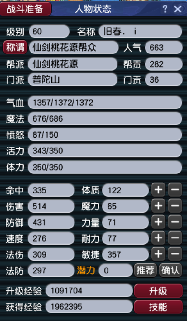 1五庄4普陀,60级,90➕60的有天阵有染色,带一组D5狗跟3只打好书的变异鲛人!(70级的高血高伤高灵装备已经准备好,有锤子可以敲!)入帮时间可以点修,五庄宝石5级,普陀3级!一手号换绑无cd,值不值可以看图