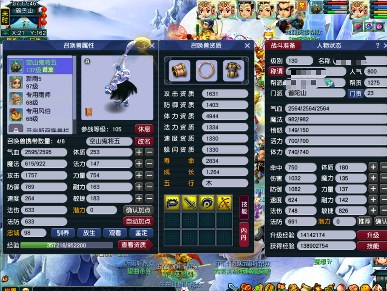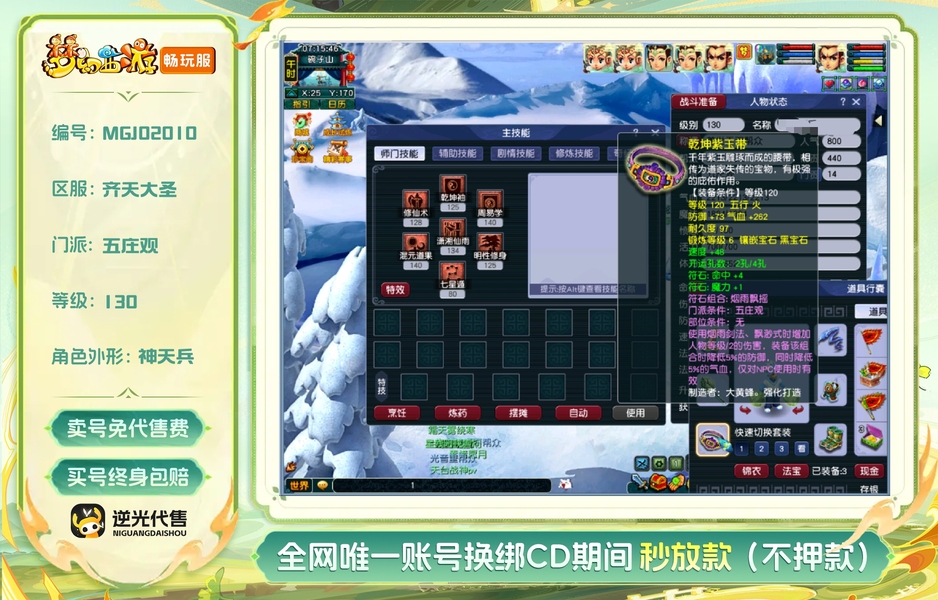 130级一五庄4普陀,没飞升,五个号都是三修15,,有2套80级普渡众生套,一组无敌高连鬼将,普通妖3回合,变异4-5回合,神游太虚10星左右无压力。去年12.18嘉年华中过神兽超级必鲨,号品非常好的一组号,藏宝阁已经可以寄售,立马可以过户,绿通还有30天,整组号,装备宝宝全在,2个号都有天阵,上手直接玩,齐天懂得都懂
