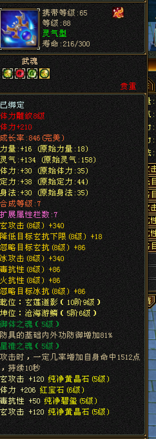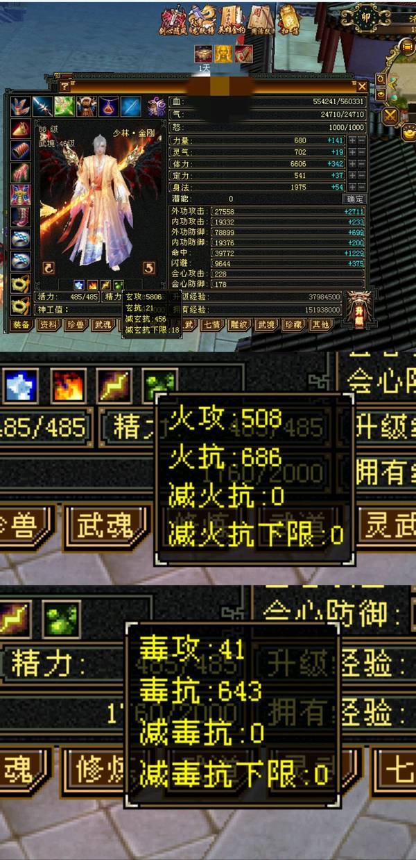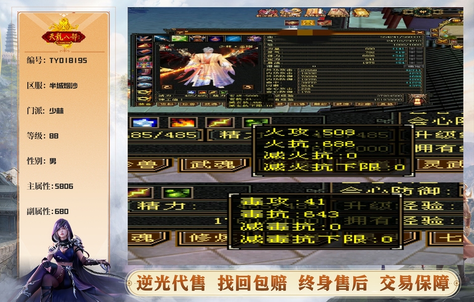 秒价出!88级火毒抗少林,不带宠物卖,属性自己看图,亮点: 1、高消费,累计消费36万多,专属客服各种; 2、骨翼、玄武等全部三种稀有色;金翅膀、雪猿坐骑、各幻视,时装(时装能洗的全部稀有色)。 3、极品血衣,可以解绑。 4、全身没有一颗4,包括减抗都是5级,白虎快5神了,幻蝶附体洗好。另外几个宠物的没有截图。
