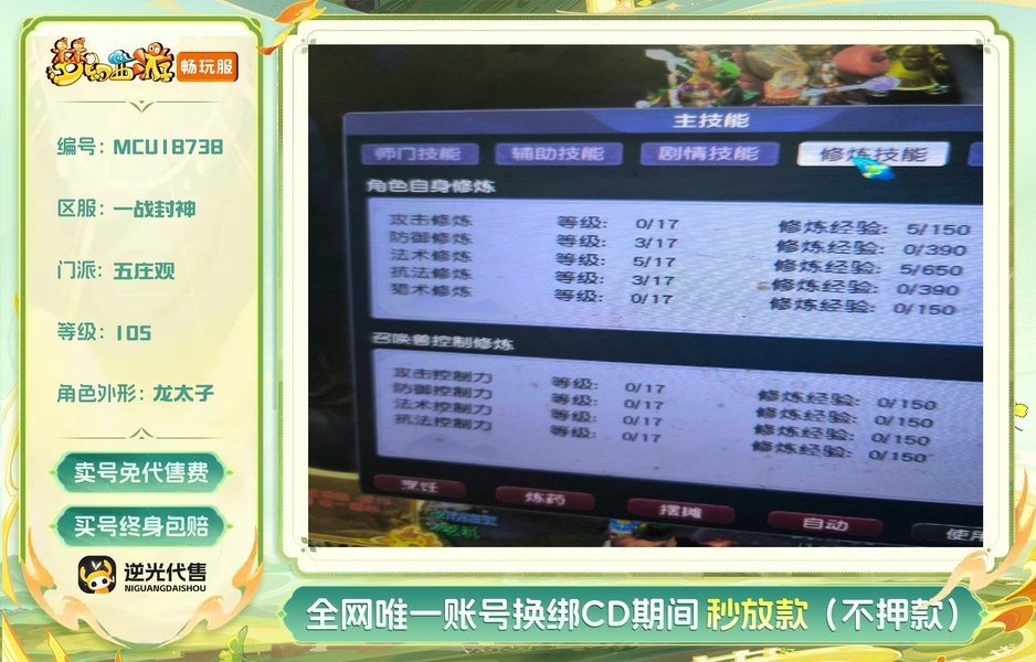 1wz1ps3pt全身10件3孔人造 540绿通带水清上手就能玩 通刷技能全满105级经验还剩9200万带一组敏捷高神凤凰和一组高必迅游都是115级带天阵带5个炼兽笼 2个号有飞行坐骑还有1000仙玉 学的强身50冥思40