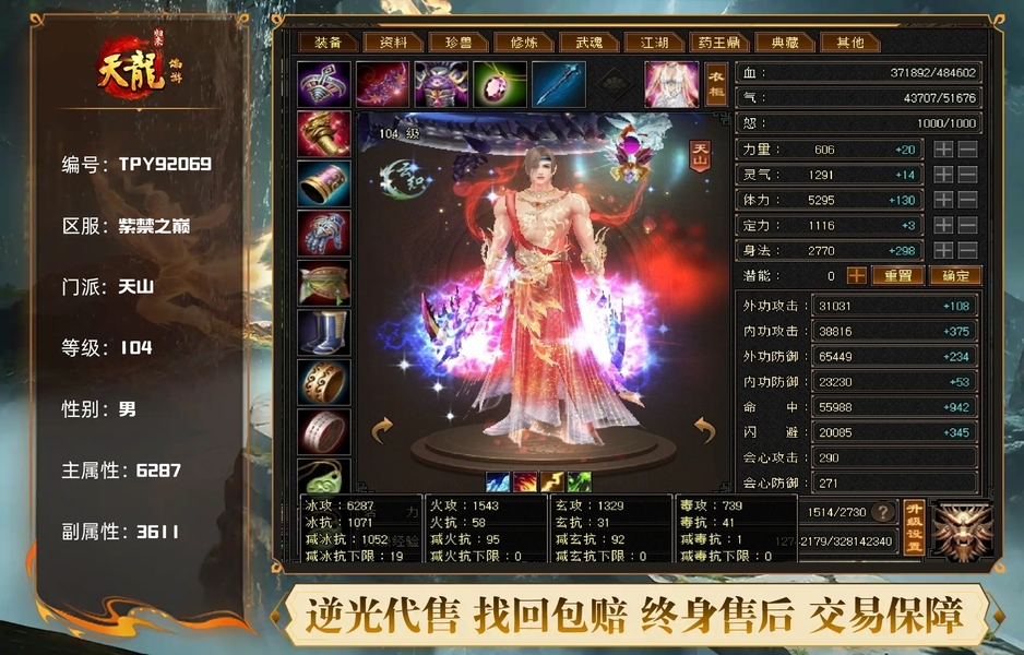 极限满六六减天山,6200属性50W血1000+冰抗,高等级9级地雕8级天雕,七夕衣服月亮坐骑红仙侣都有,可辅助上格子,银行卡没有绑定,接小刀