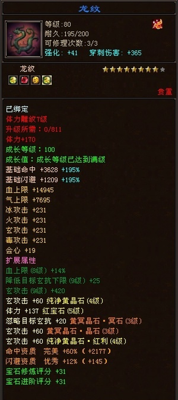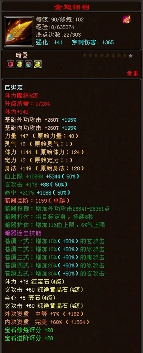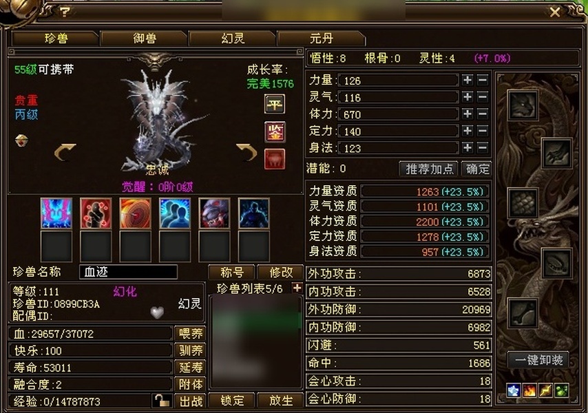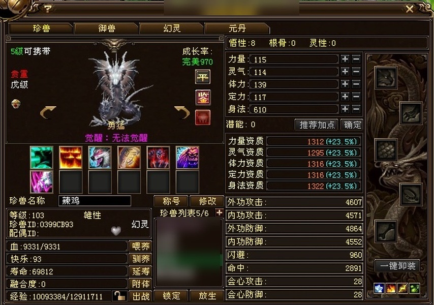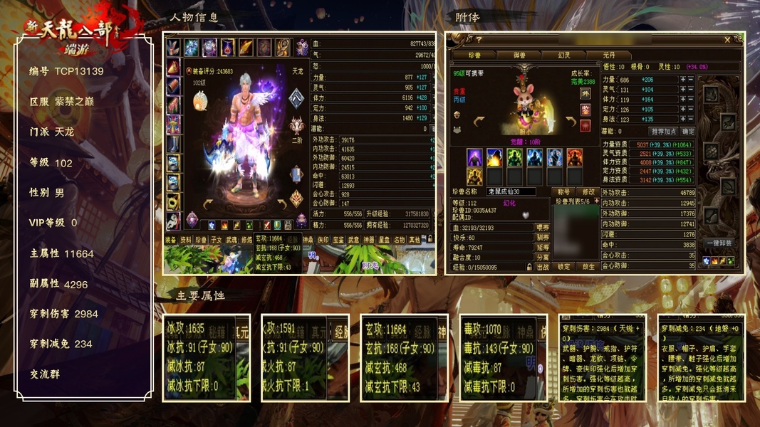 天龙 | 等级:102 | 主属性:11664 | 男 | 评分:243683 | 副属性:4296 | 穿刺伤害:2984 | 穿刺减免:234 | VIP0 | 【买号找回永久包赔】