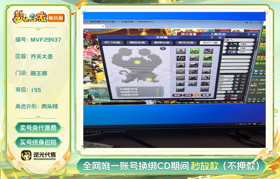 155魔王号,刚在格子上买的,因工作原因不能长期玩,刚续的绿通,有天阵 有装备 有宝宝,上号就能玩 ,后续配合过户 号上还有个540 一战封神的摆摊号