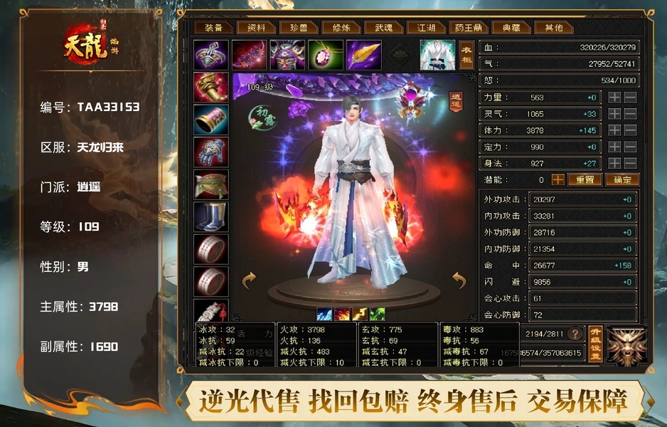【TAA33153】 | 逍遥 | 等级:109 | 主属性:3798 | 副属性:1690 | 男 | 主火攻
